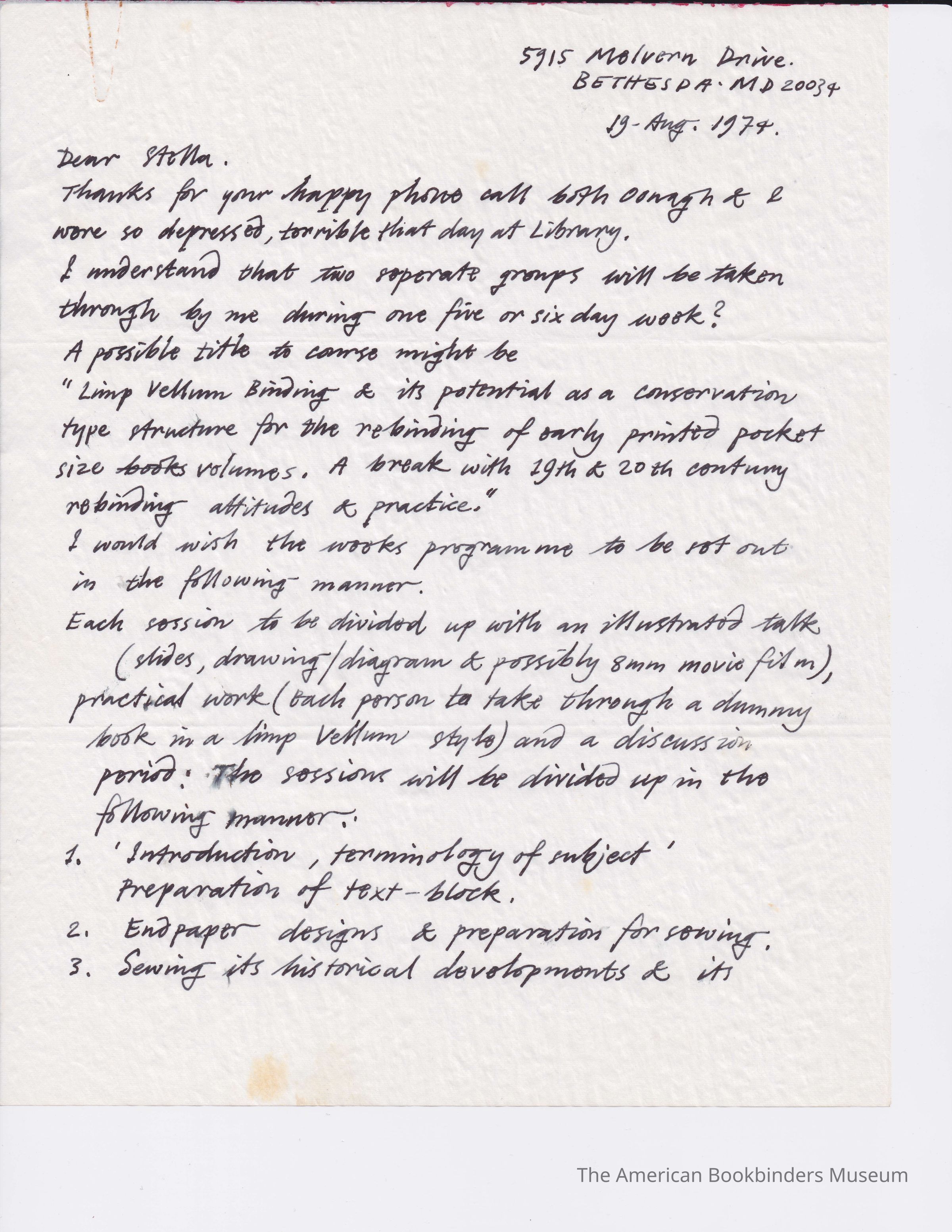 Letter from Clarkson about what materials students should expect to bring to the limp vellum binding workshop.Collection