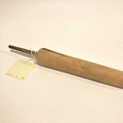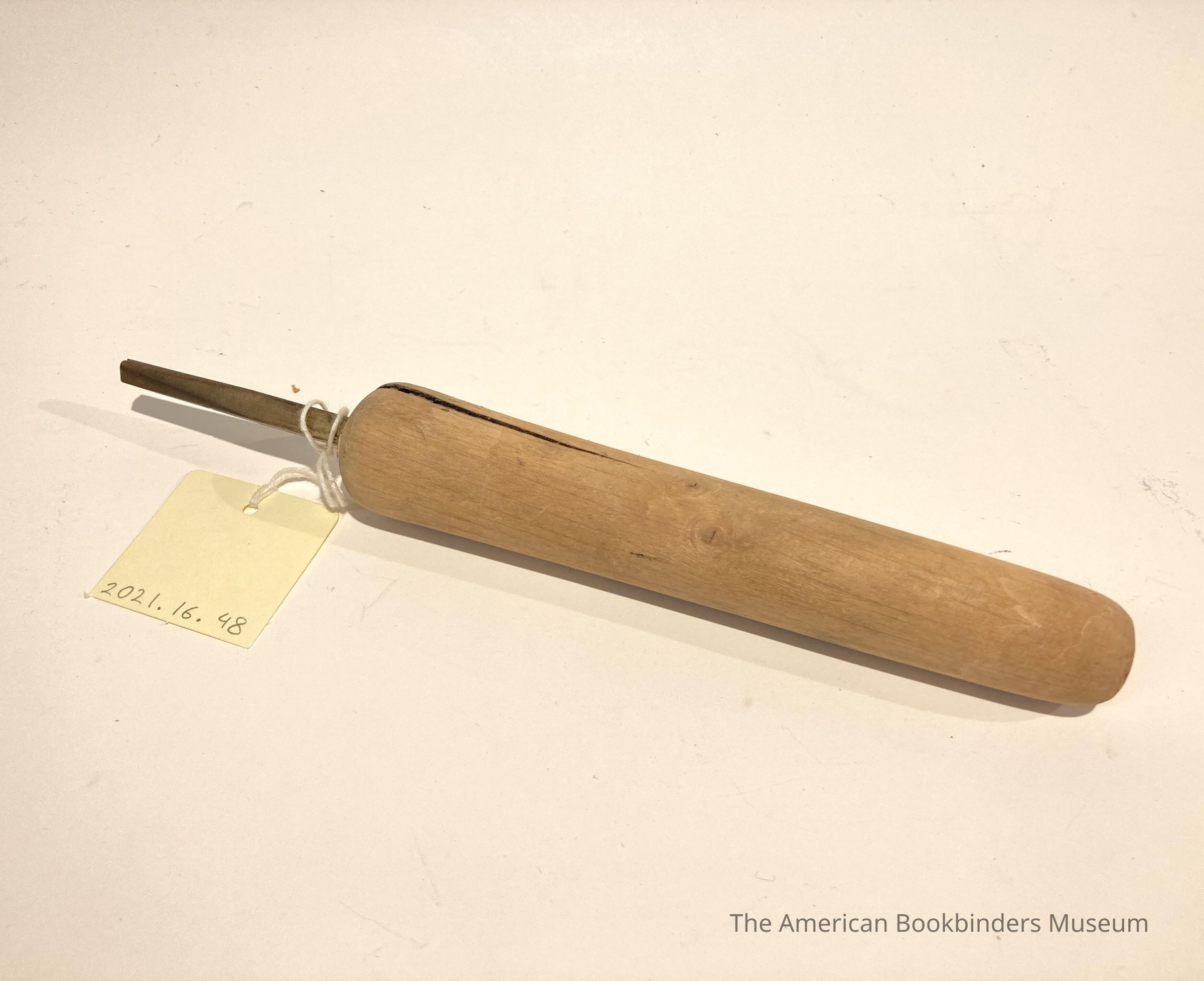Hand stamp with wood handle. Small, 1/2cm spade design with negative line cut vertically through the center.