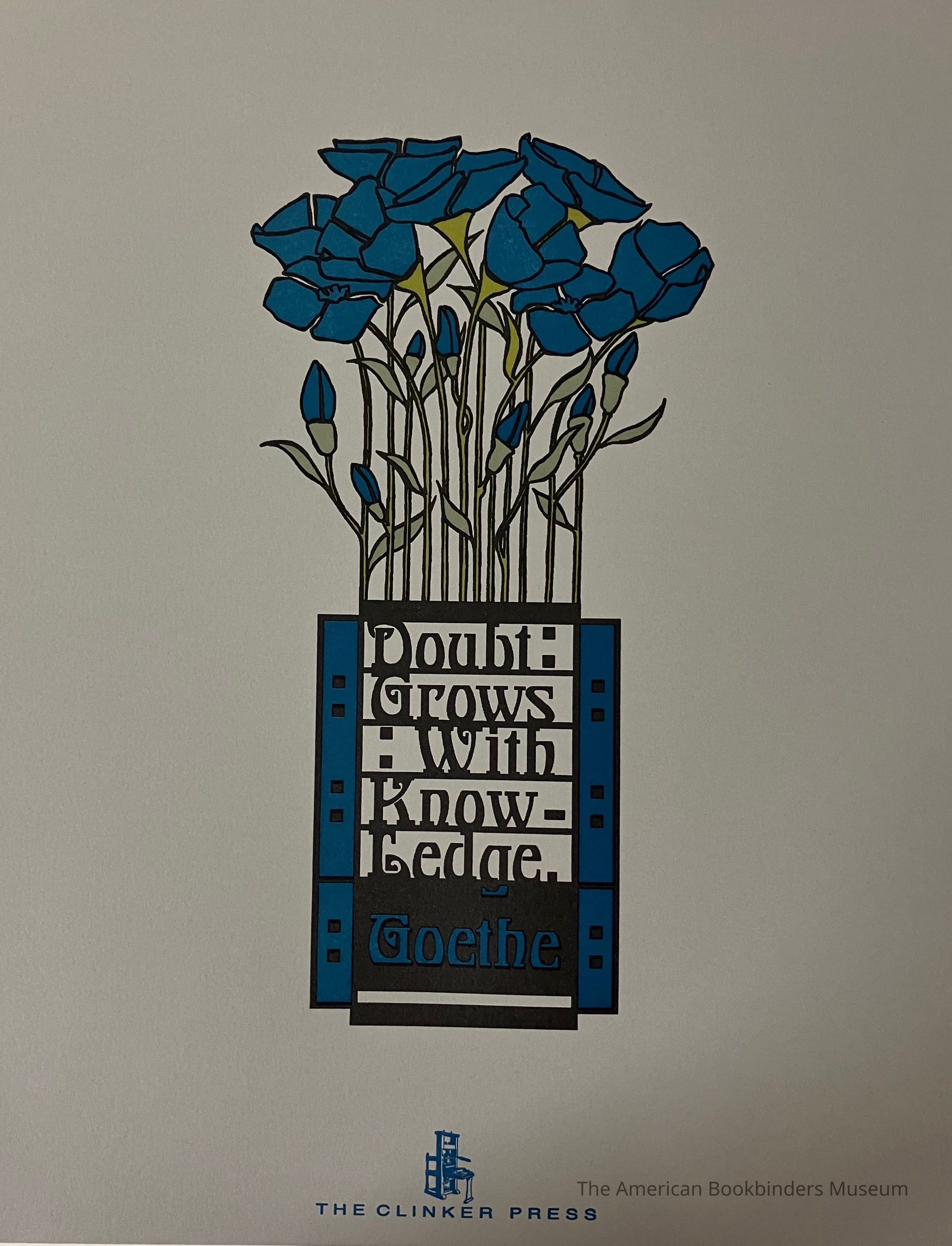 Quote by Goethe. Above the quote is a line of blue flowers (California poppies?) in various states of blooming. Printed on gray paper.Collection