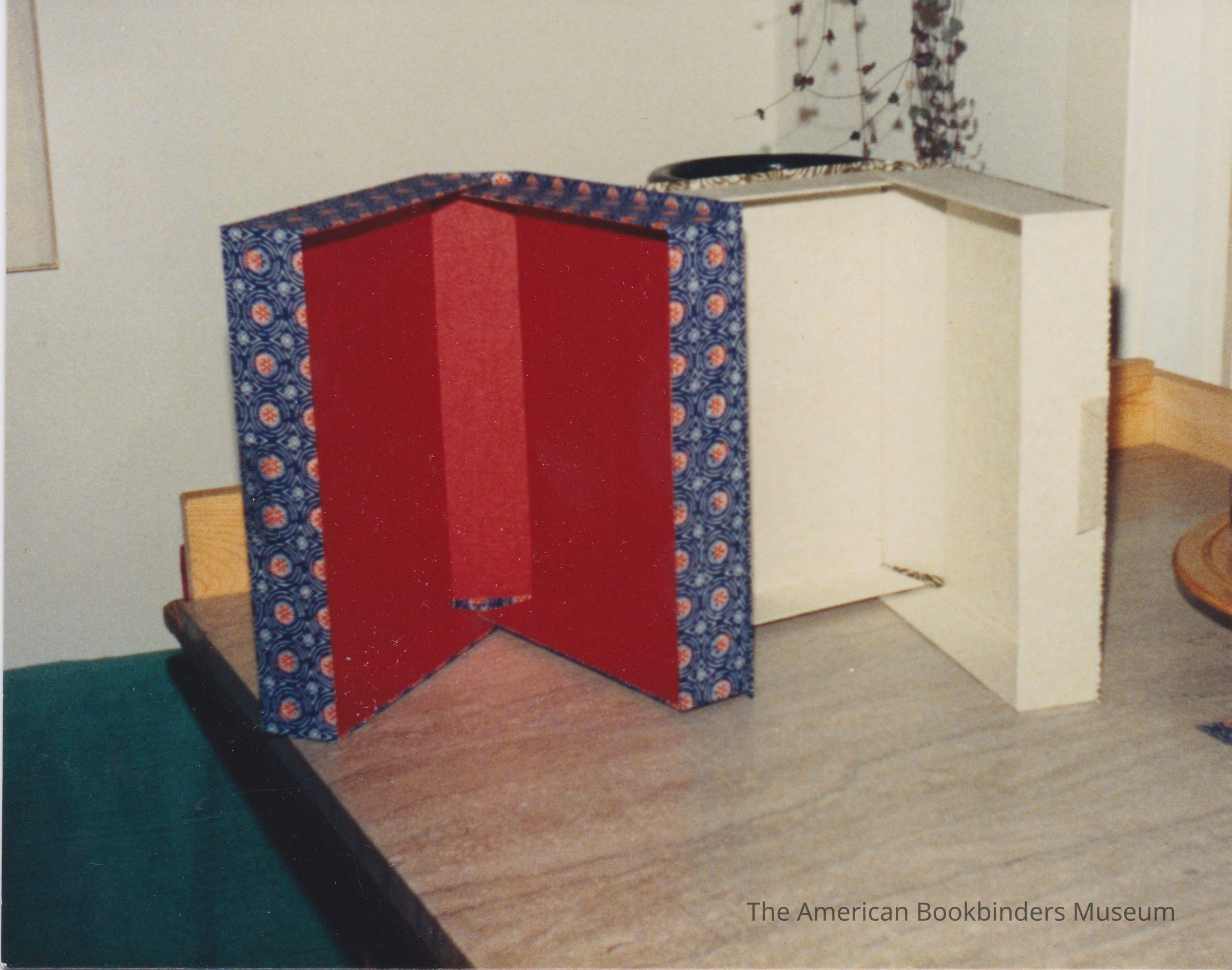 Two decorated clamshell boxes. One has a geometric pattern of white on a navy background with a red interior. The other has a white interior and the pattern is not visible.Collection