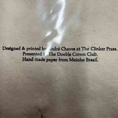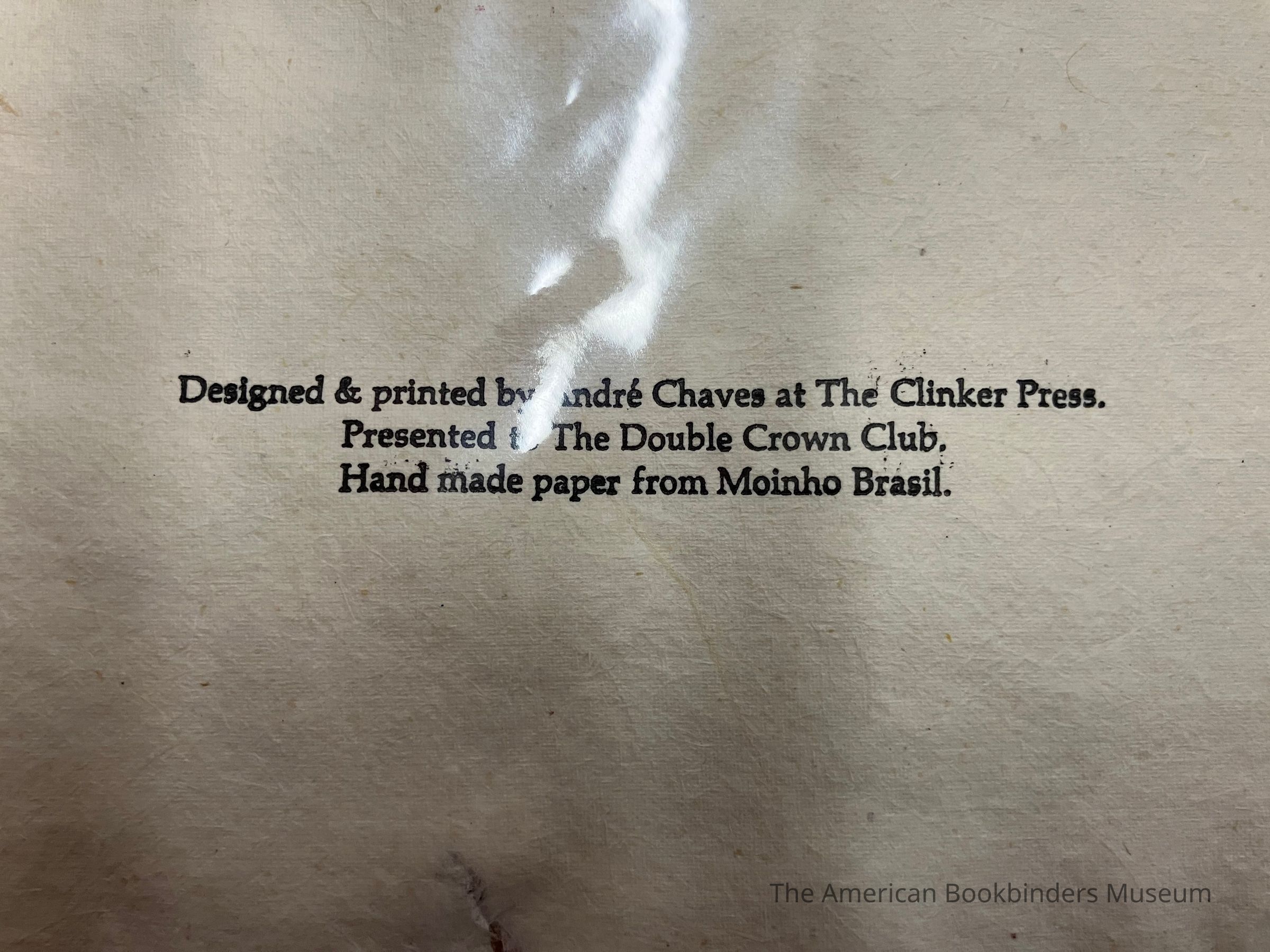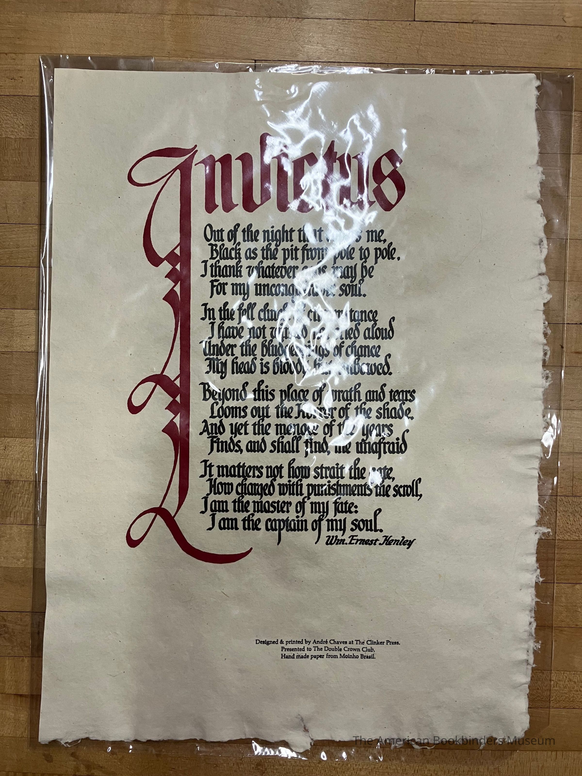 Wrapped in plastic. Title in red, with the first letter running the length of the poem. Rest of the text below in black, with author at the end. Context at the bottom. Bottom and right edge is raw.Collection