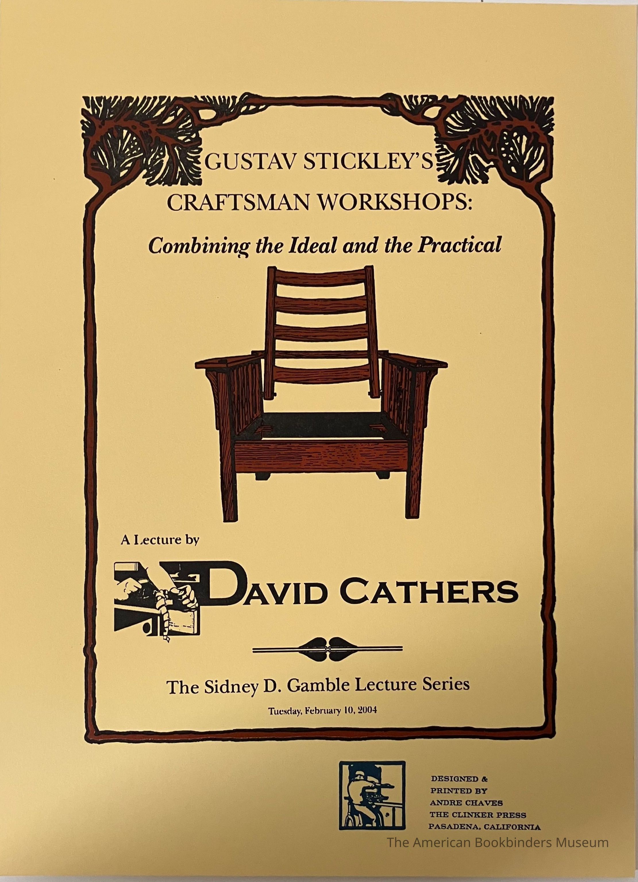 An ad / brochure for a lecture held Tuesday, February 10, 2004. Yellow paper. A frame of branches in red, forming a continuous line across the bottom and up most of the sides, with more natural branches and thin leaves forming the top corners. At the top of the frame is the title, and below that is a chair, and under that is the lecturer's name.Collection