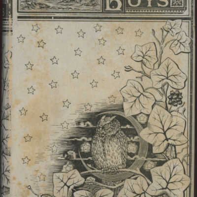 Bound in tan cloth with navy blue stamped decoration depicting an owl framed within a circular moon perched on a climbing leafy vine. This motif repeats to the spine. Very scarce matching dust jacket in mylar sleeve over book.Notes