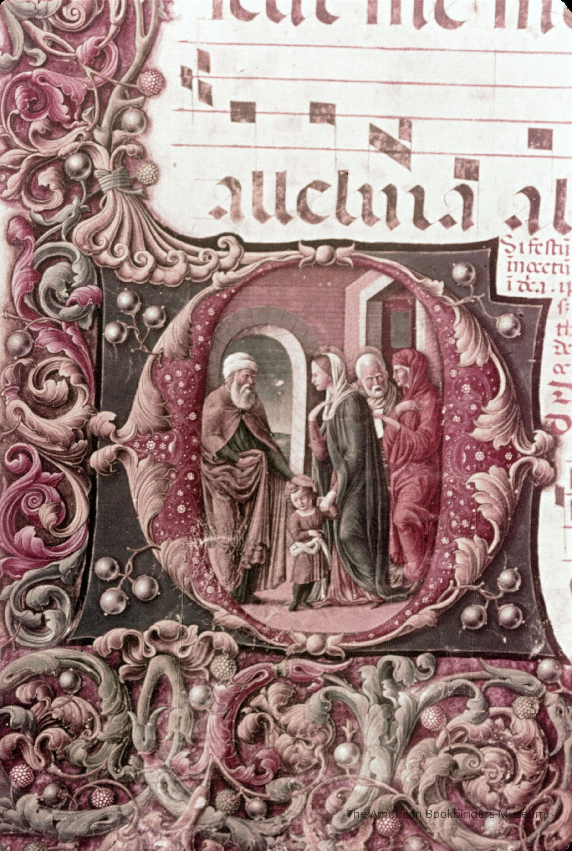 Scan of a slide. Shows a detail of a manuscript, focusing on a scene with Biblical figures. There is a border on the left side with acanthus leaves. At the top is some old sheet music. The biblical figures may be Mary but the color isn't very clear in the slide.Photograph Details