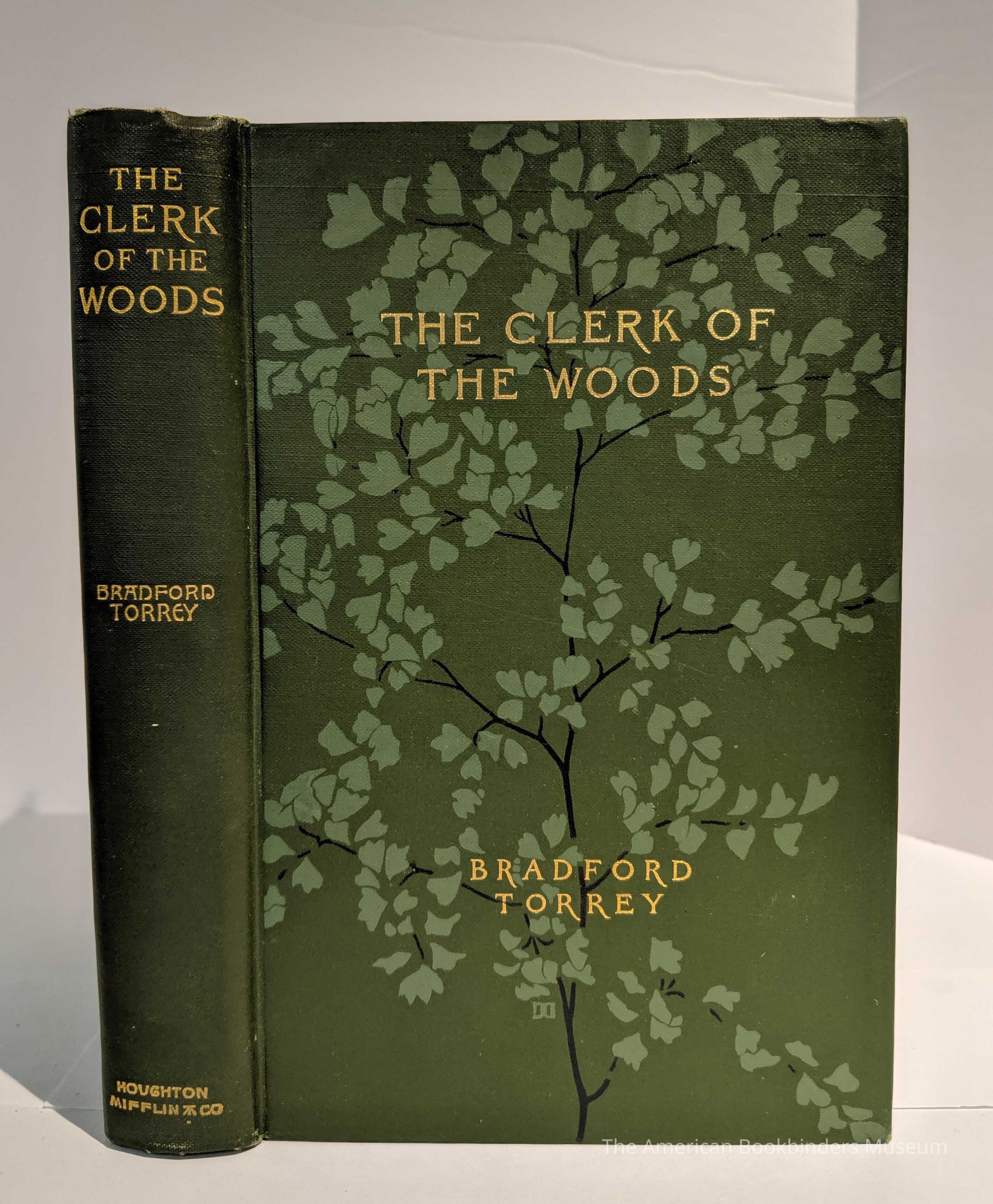Bound in olive green cloth and stamped in black and light green in a leaf and branch design that fills the entire cover, with branches extending off the edge of the board. Title and author stamped in gilt to the foreground. Undecorated spine stamped in gilt.