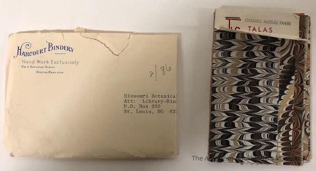 Small stapled sample book of marbled papers. Includes mailing envelope from Harcourt Bindery.Collection
