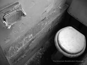 A small, dirty bathroom and instead of toilet paper there is half a book hanging on the wall.