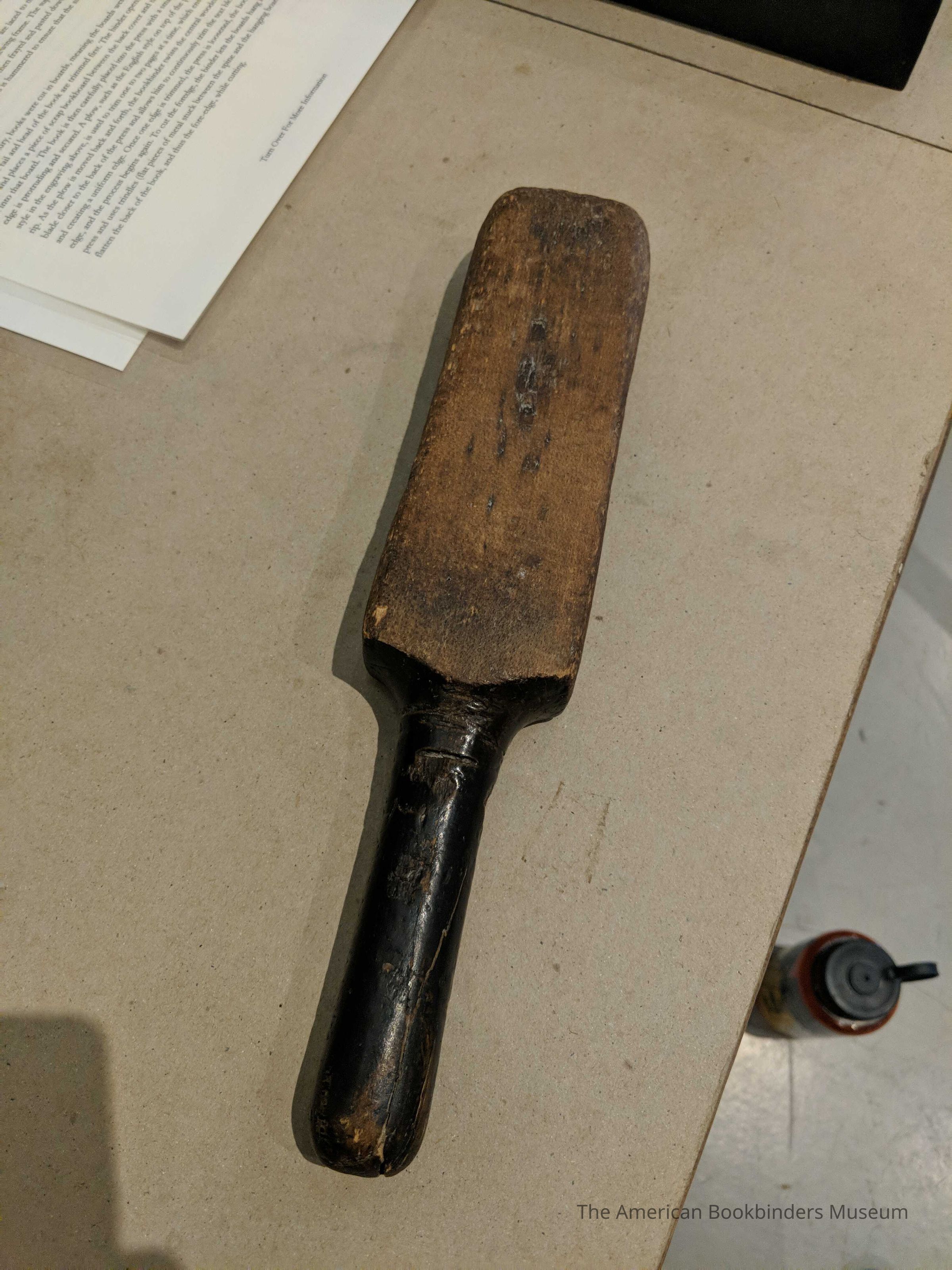 Wooden rectangle with a handle, weighted at the head of the mallet. Handle is worn smooth. The text block is tapped down during the sewing process using this instrument.Use