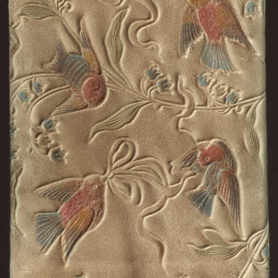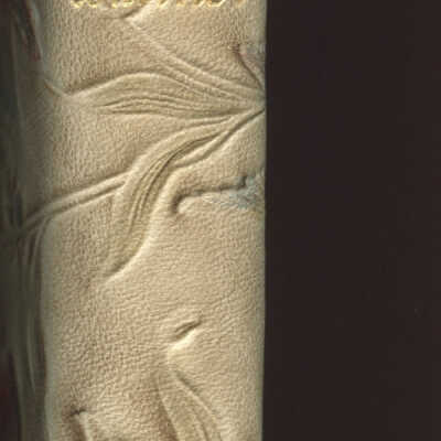 Bound in a padded, machine tooled cream and brown colored pseudo leather with a detailed pattern of songbirds, ribbons, vines and flowers in pastel colors. "Whittier" in gilt to both spine and front cover. Pastel machine marbled endpapers.