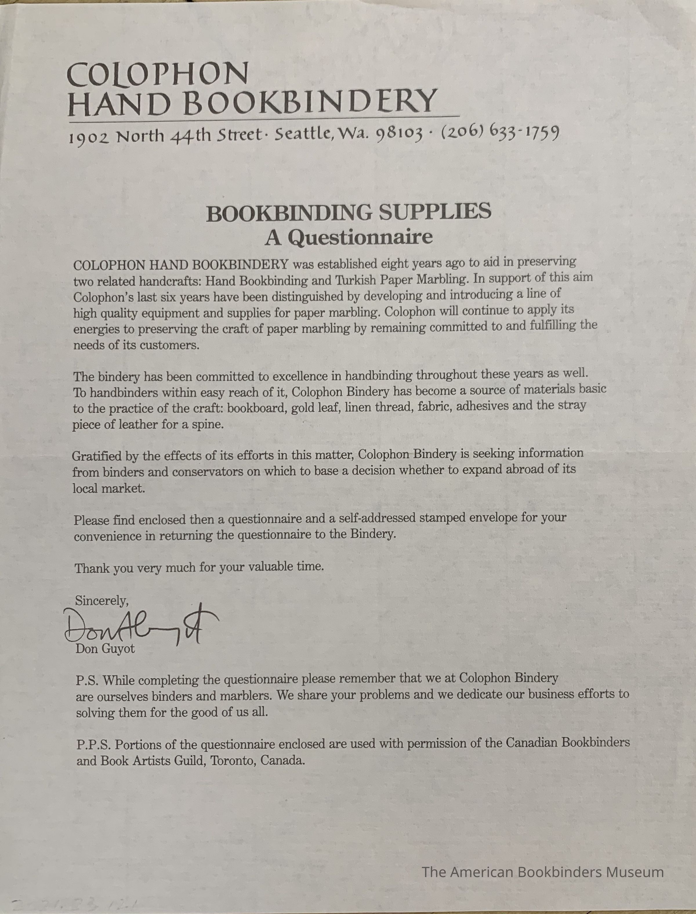 Bookbinding supplies: A questionnaire.Entry/Object ID