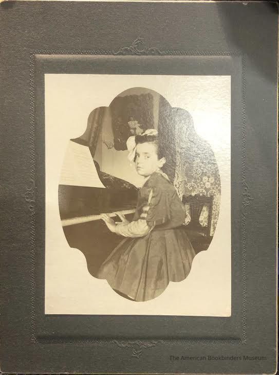 A black and white, photo of Stella Patri, age 12, at the piano. Patri is out of focus. The background has another photo hung on the wall and a lace curtain on the right. The photo is pasted on a backing.Photograph Details