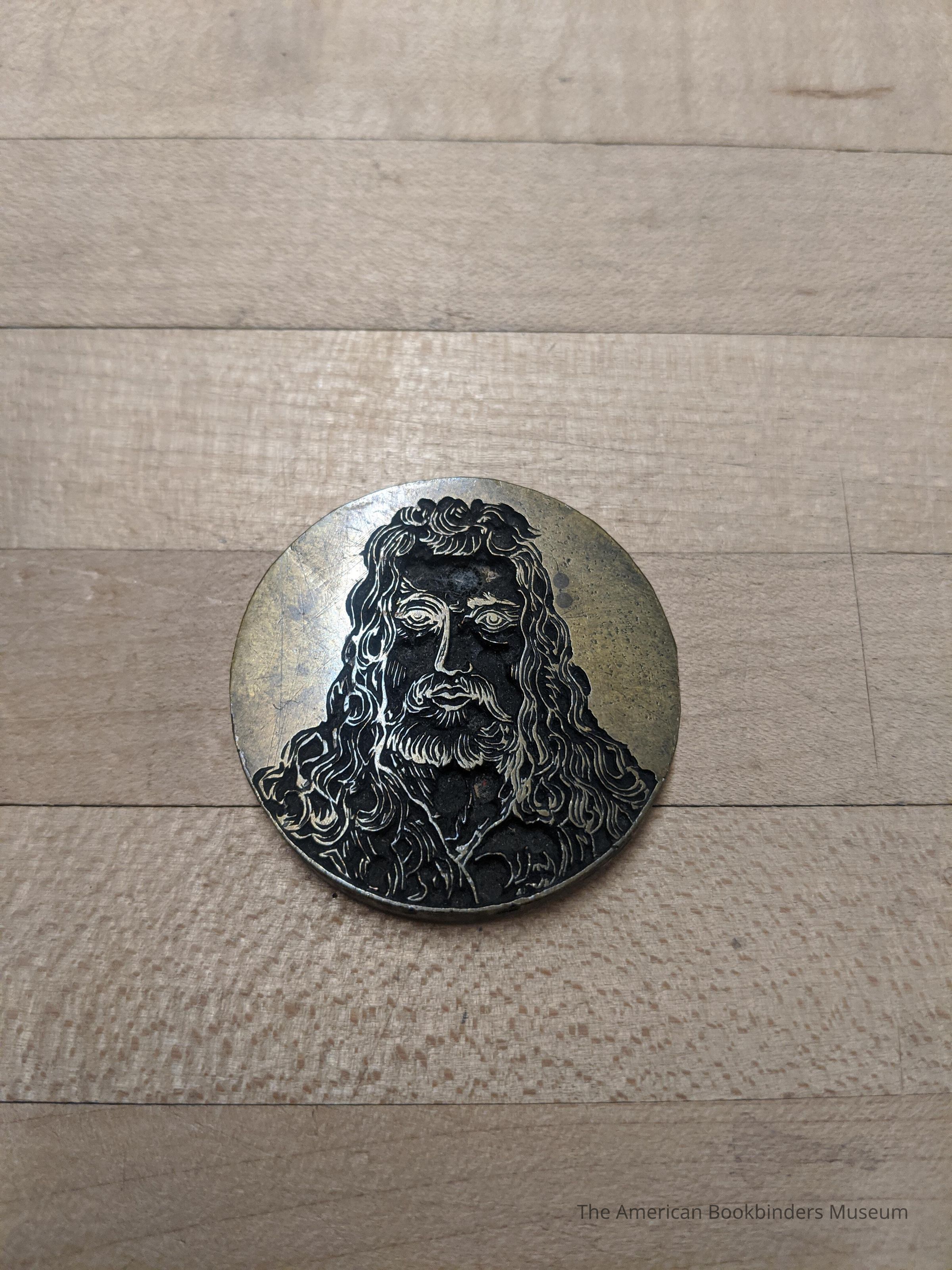 Portrait of a male bust, with long wavy hair, bangs, a full beard and mustache.
