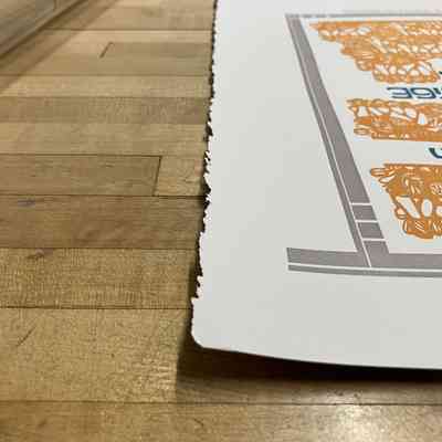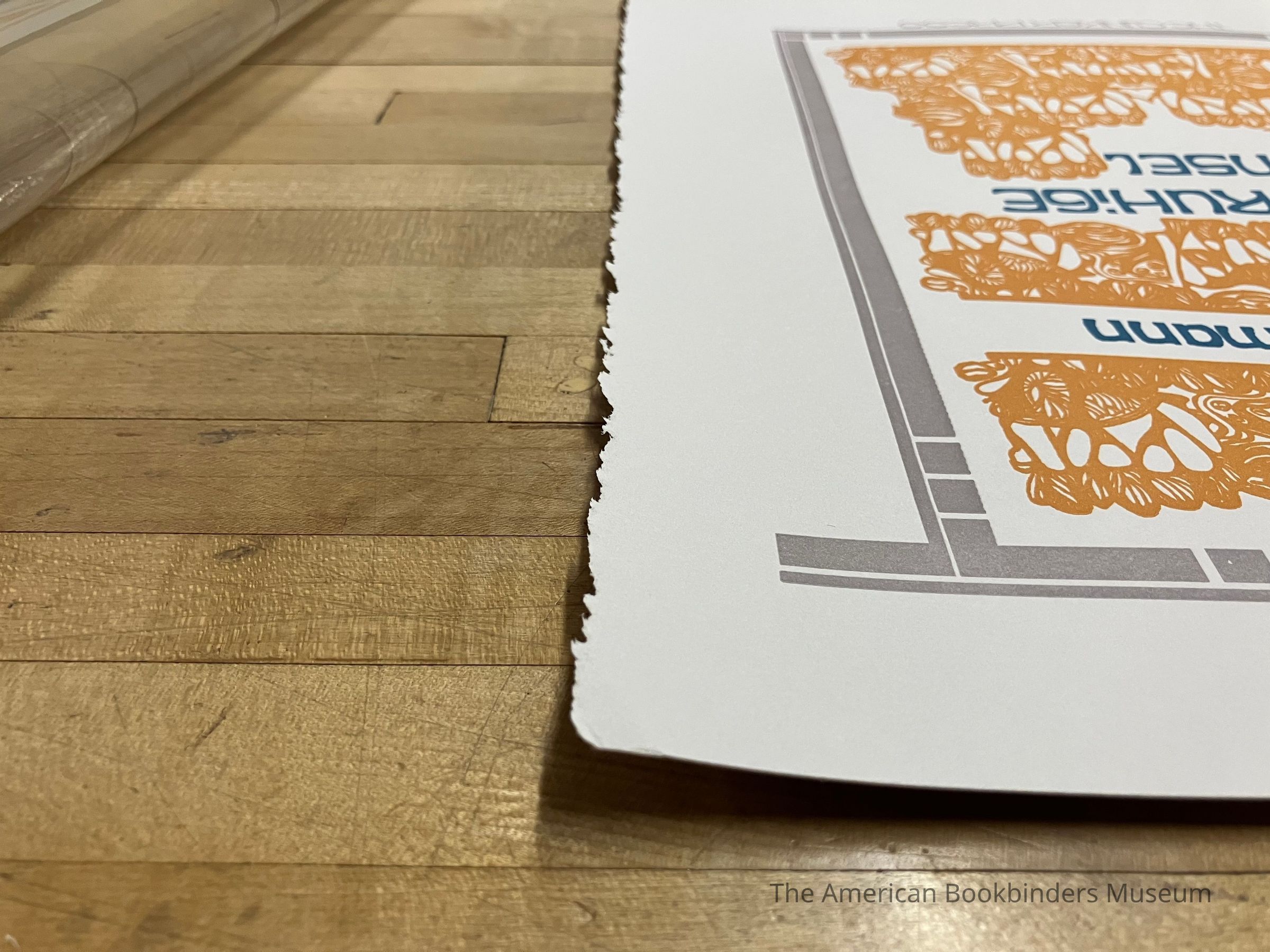 Gray border, with small lines taken out to create squares. Paper-cutout shapes in orange surrounding author and bottom half, in orange. Title in the center, author's name in top half, both in darker blue. Right edge is raw.Collection