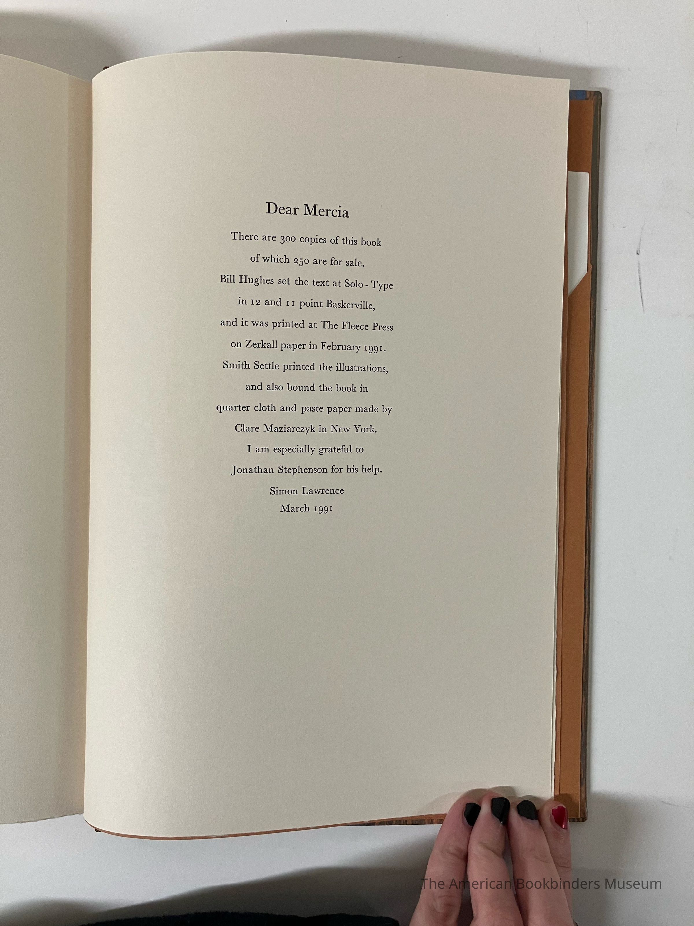 Colophon at back - 300 copies, 250 for sale. Bill Hughes set the text at Solo-Type in 12 and 11 point Baskerville, printed at The Fleece Press on Zerkall paper in February 1991. Smith Settle printed the illustrations and bound the book with paste paper by Clare Maziarczyk in New York.