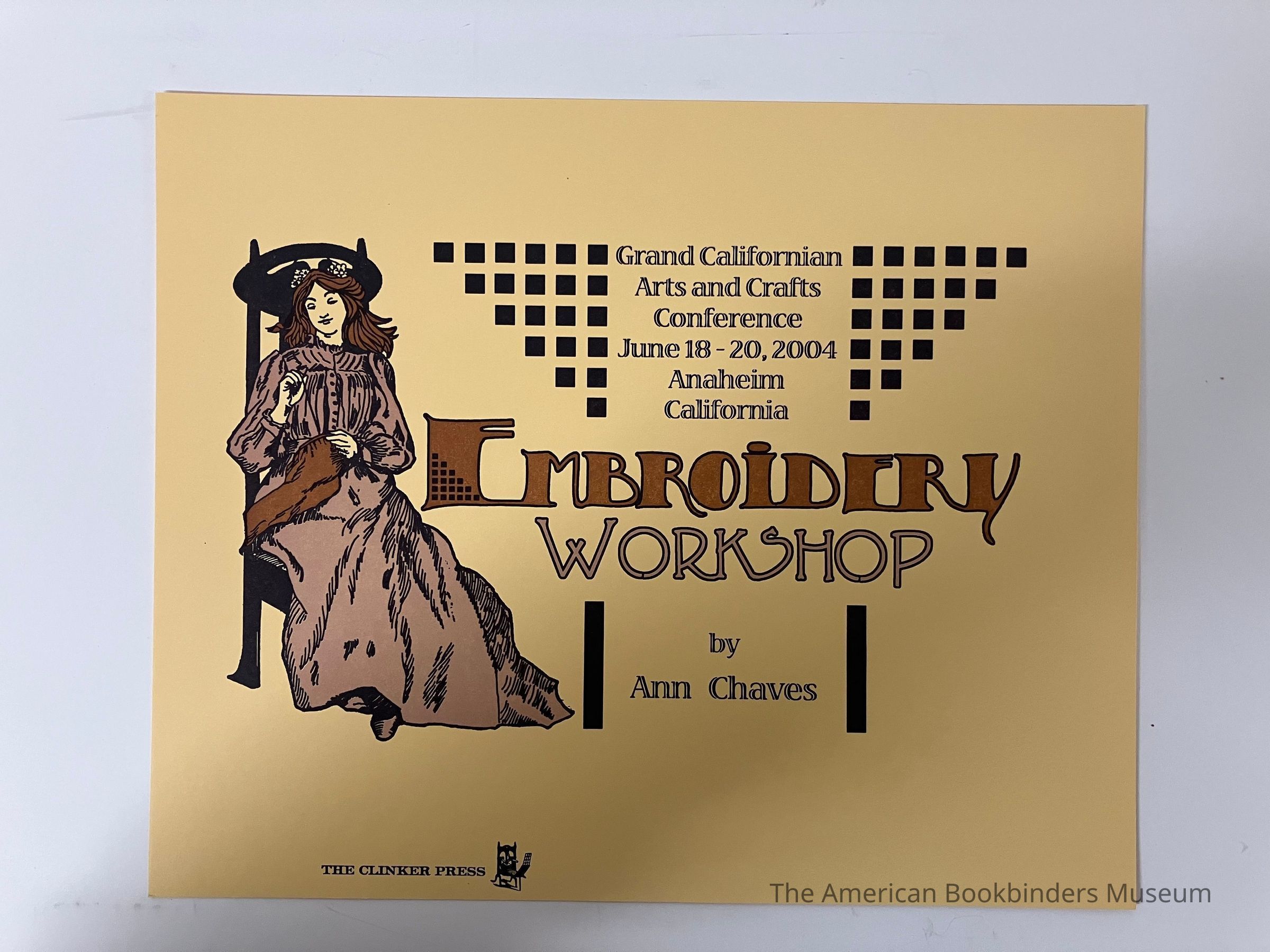 Yellow paper. Brochure for a workshop by Ann Chaves as part of the Grand Californian Arts and Crafts Conference in June 2004 in Anaheim. An image of a woman doing embroidery is on the left. Main title in the center, with the date and location voce between 'stairs' of squares.Collection