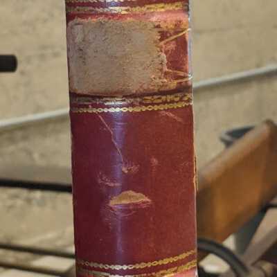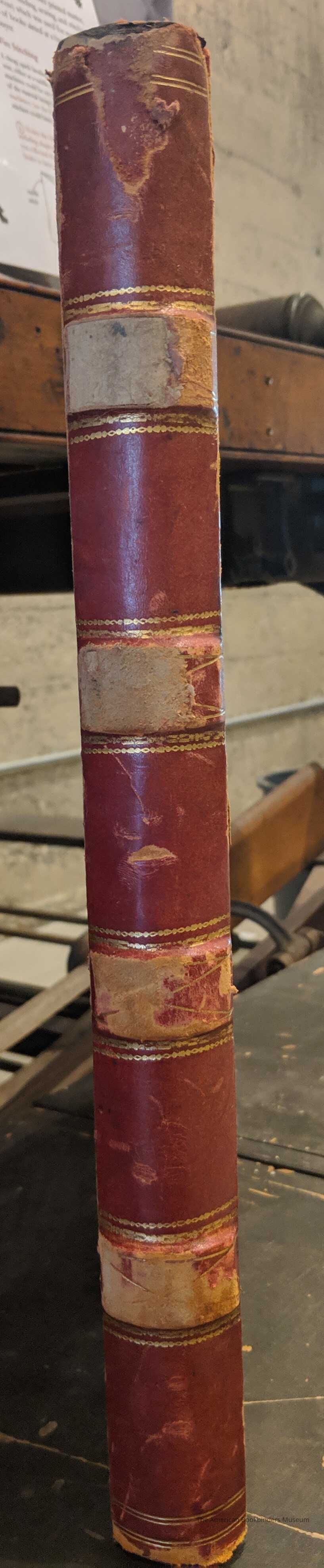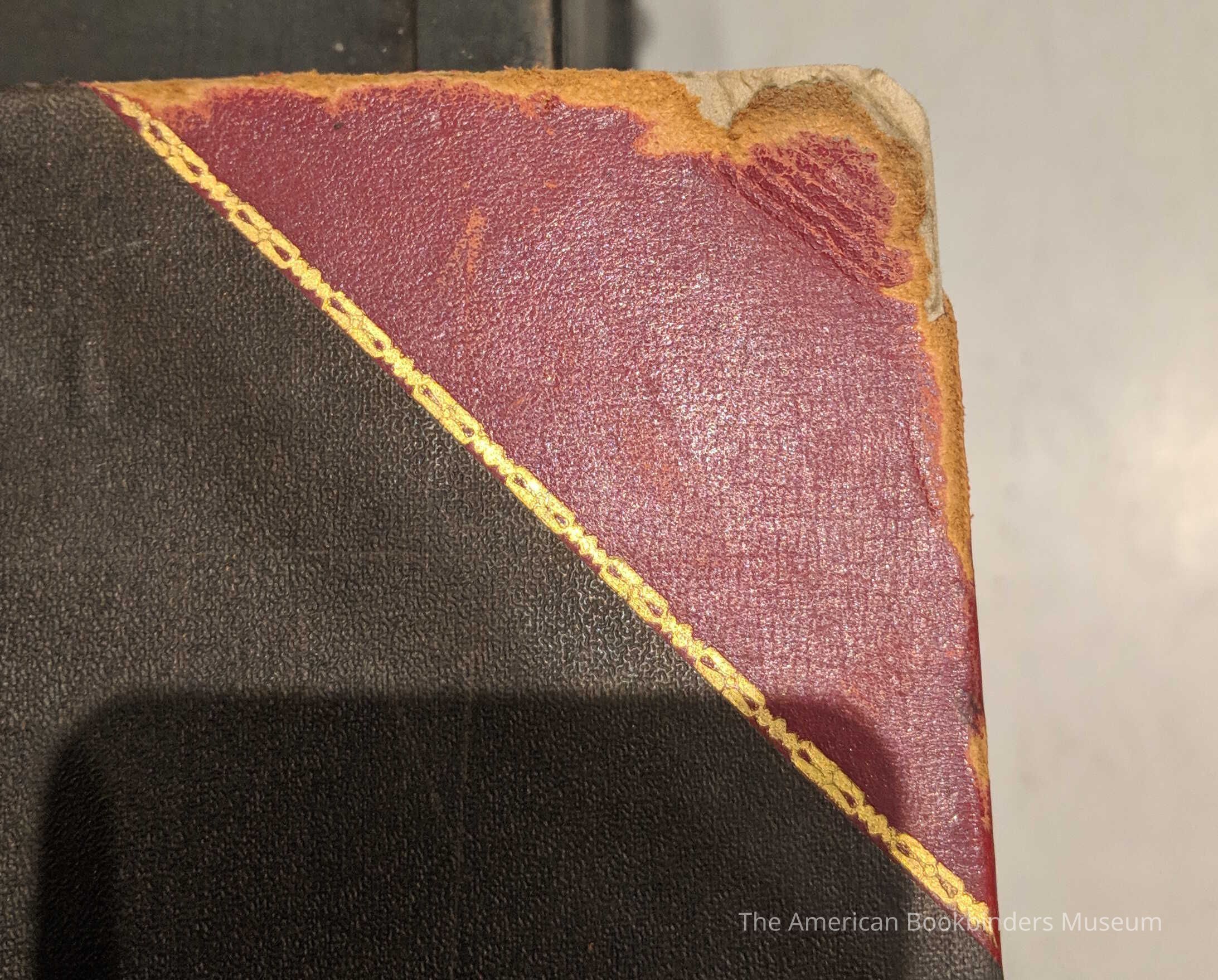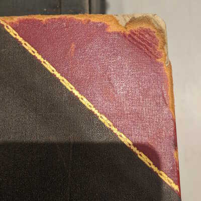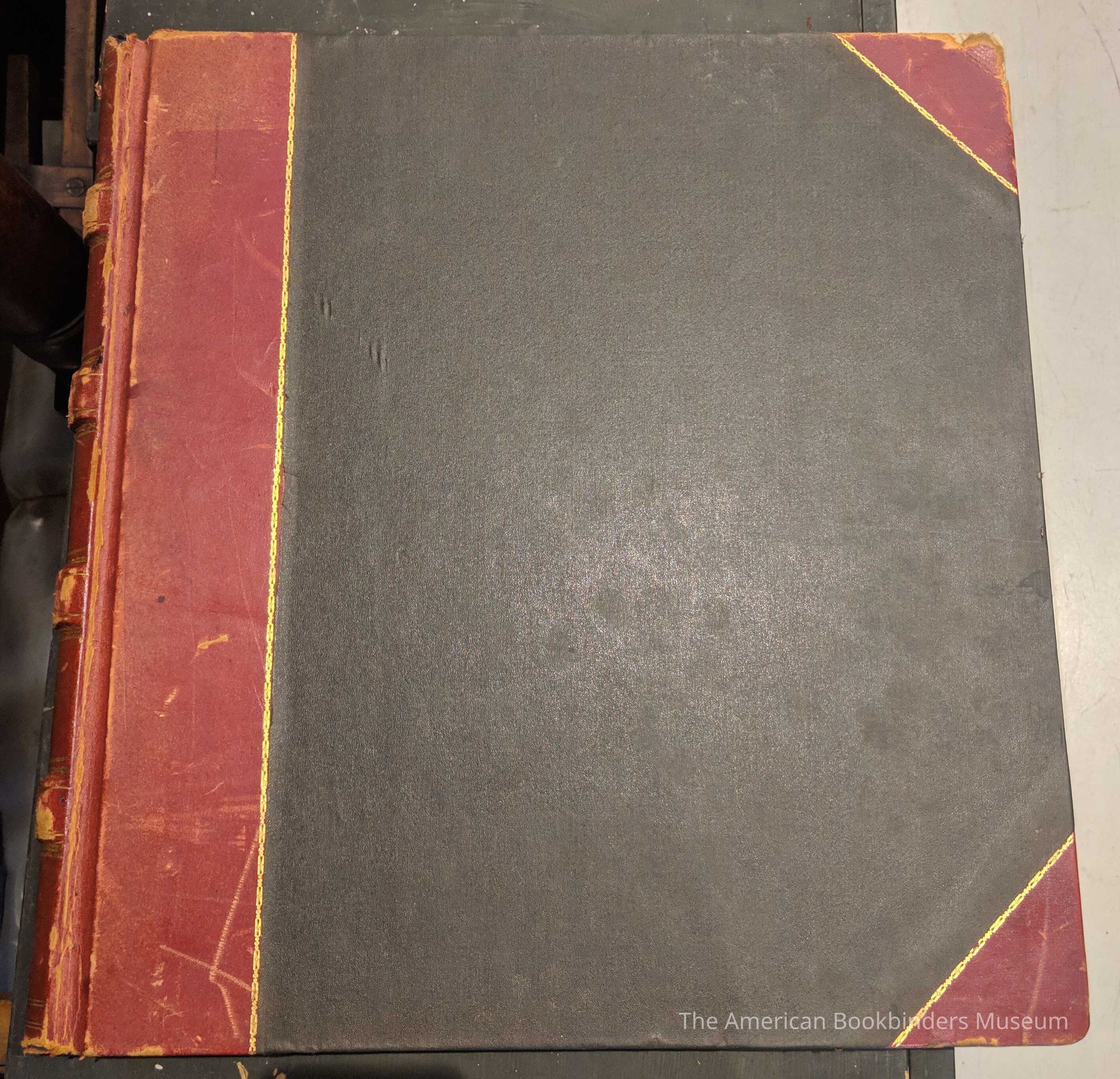 Ledger book, quarter red leather cover, black book cloth. Gold tooling along spine and corners. Raised bands (maybe fake?)
