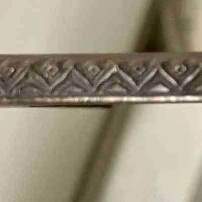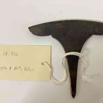 Metal engraved pallet. Creates a simplified flower shape, with the dots along the top and triangles along the bottom, separated by 'leaves', with a separate horizontal line running along the bottom.Use
