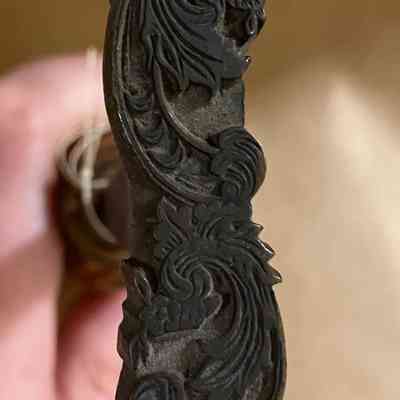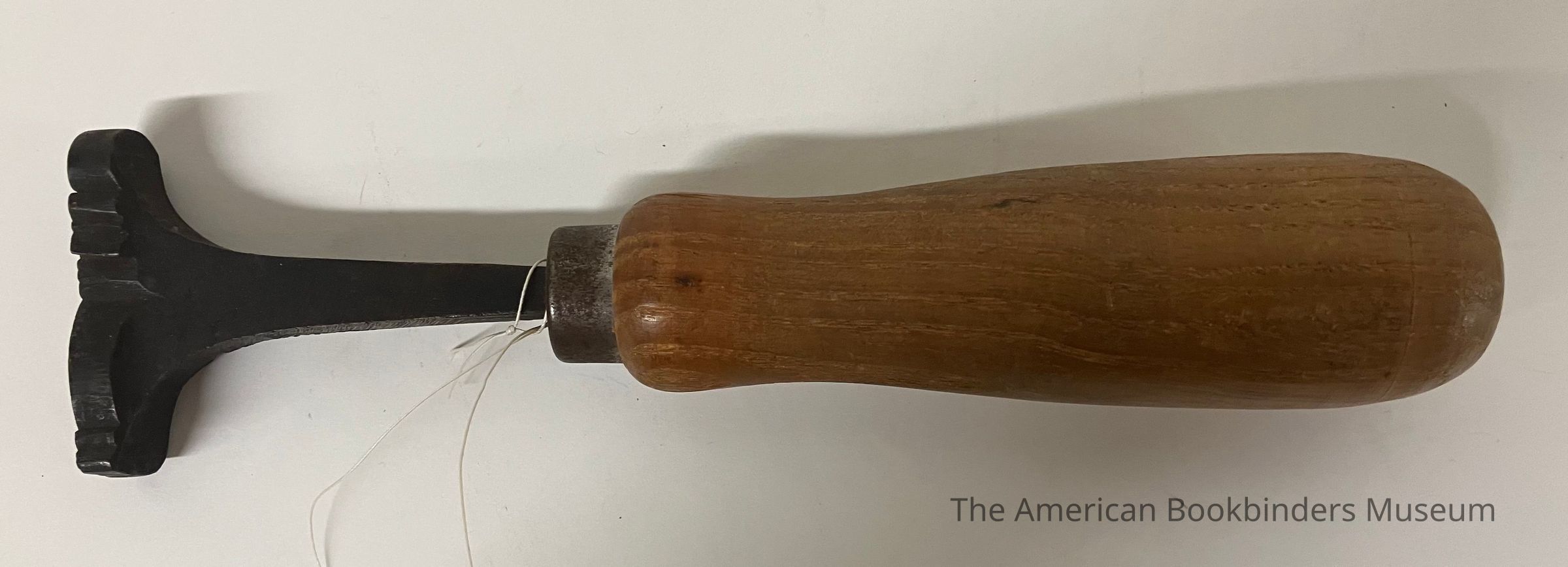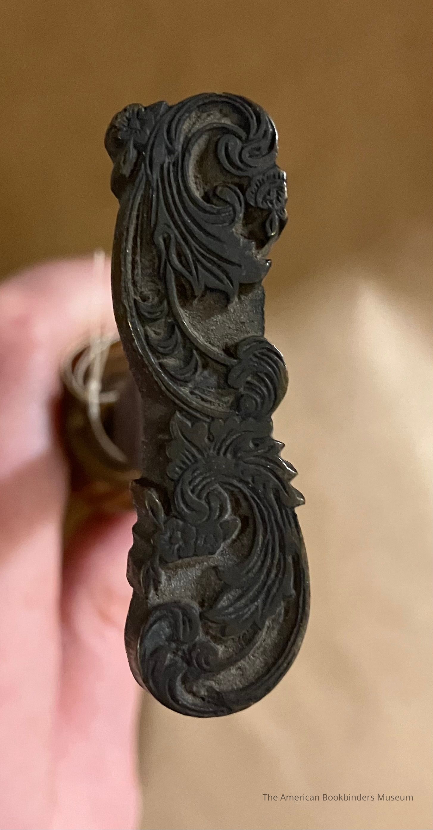 A hand finishing tool showing a pair of leaves curling outward, with tiny flowers.