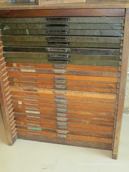 24 drawers, with a variety of dividers built in the interiors set up for type forms. They are labeled "Hamilton."
