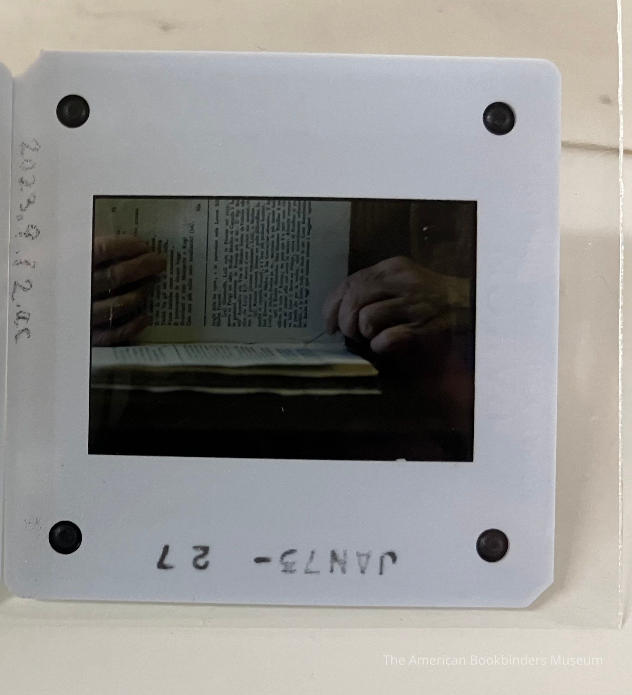 Slide showing Patri's hands and a text block on a sewing frame, with Patri sewing the text block together. One page is held up, with Patri showing where the needle should be placed, here at the bottom of the page. Similar to 2023.9.12.ab.Photograph Details