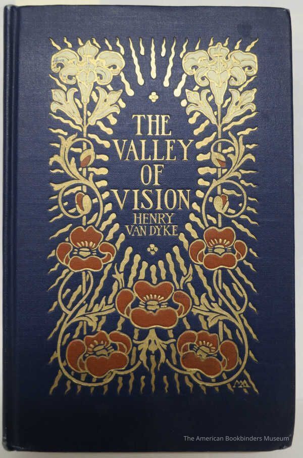 Art nouveau cover design in gilt, white and rust stamped upon navy blue cloth. Gilt titles and design to spine. One of a series of uniform bindings designed by Armstrong for Van Dyke titles issued by Scribners.