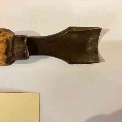Metal gouge in wood handle. Wood has dark surface, worn away in patches to show bare wood.Use