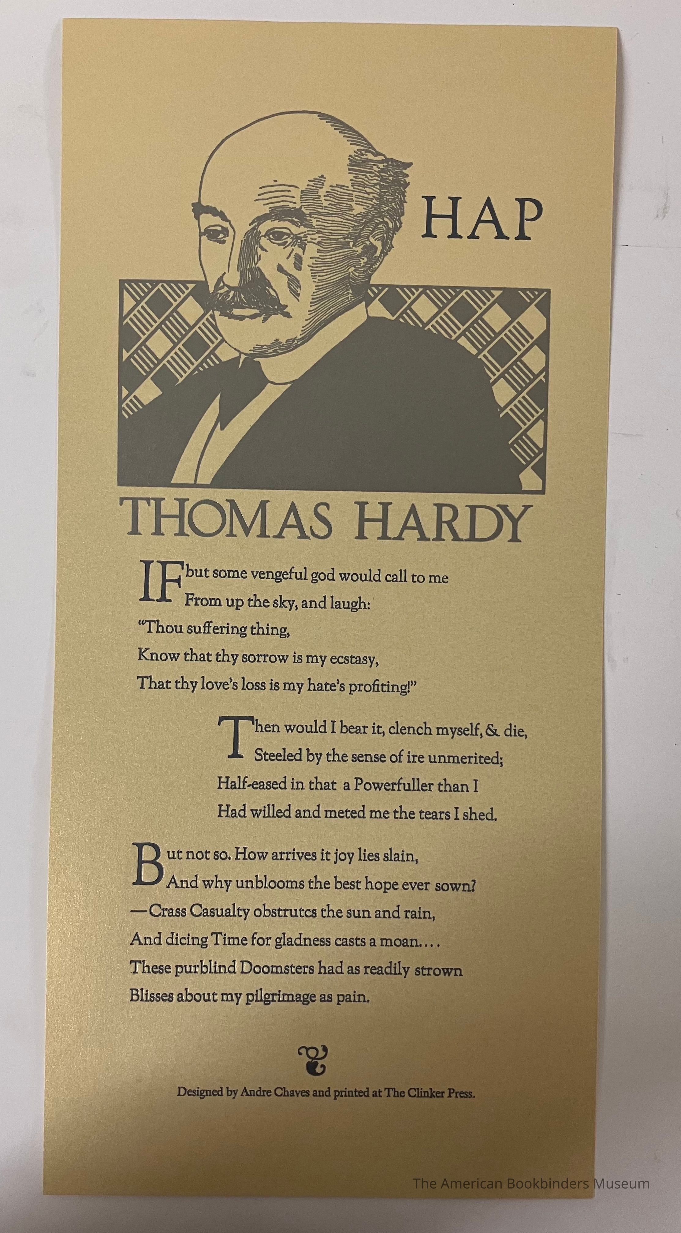 On yellow paper with a fine shimmer. Illustration at the top of Thomas Hardy in a light gray with a striped background. Quote below has drop caps, in a darker grayCollection
