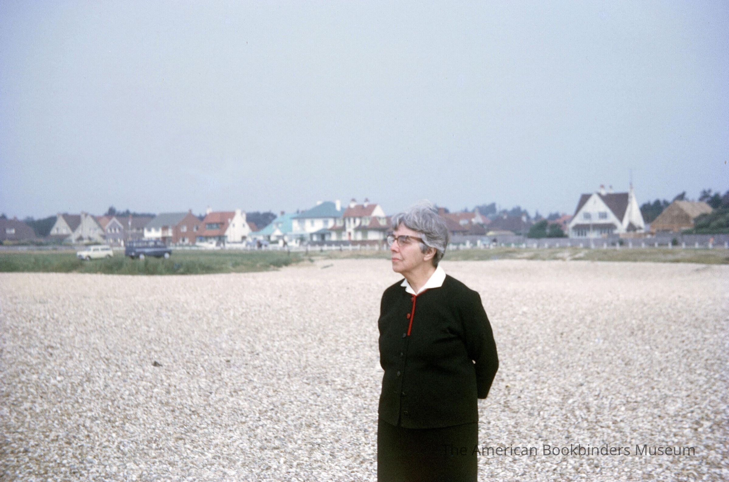 Scan of a slide. Shows Stella Patri in the foreground. She may be at a pebble beach. There is a line of houses in the background.Photograph Details