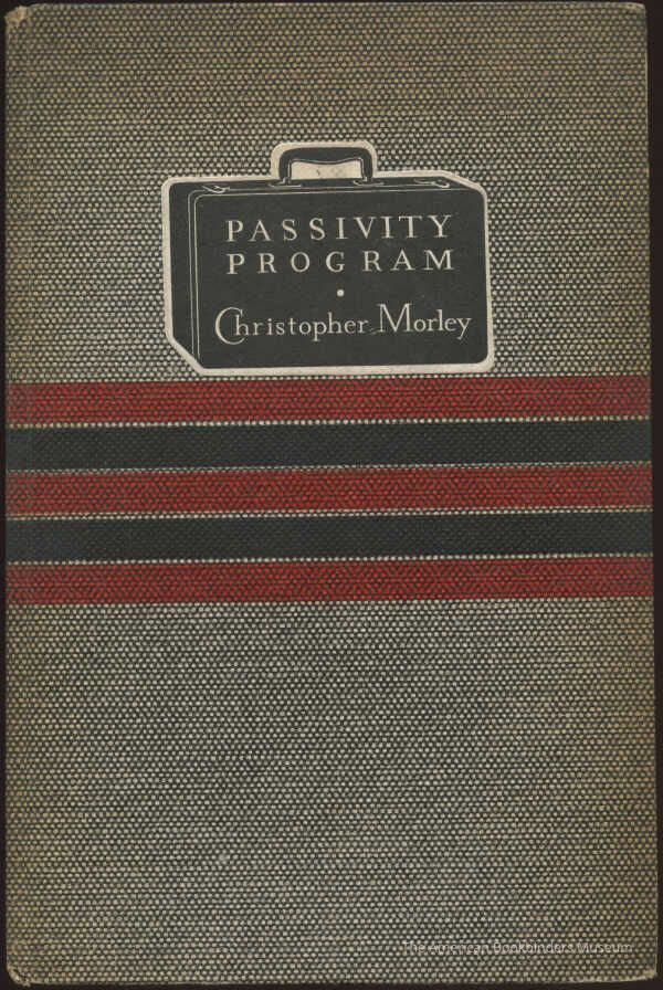 The paper covered hardcovers have a fabric texture that resembles the cloth of a vintage suitcase with a grey, red and black striped design. The title is a paper onlay label in the shape of a suitcase (printed in black and white.) Printed in red and black on heavy, quality stock.
