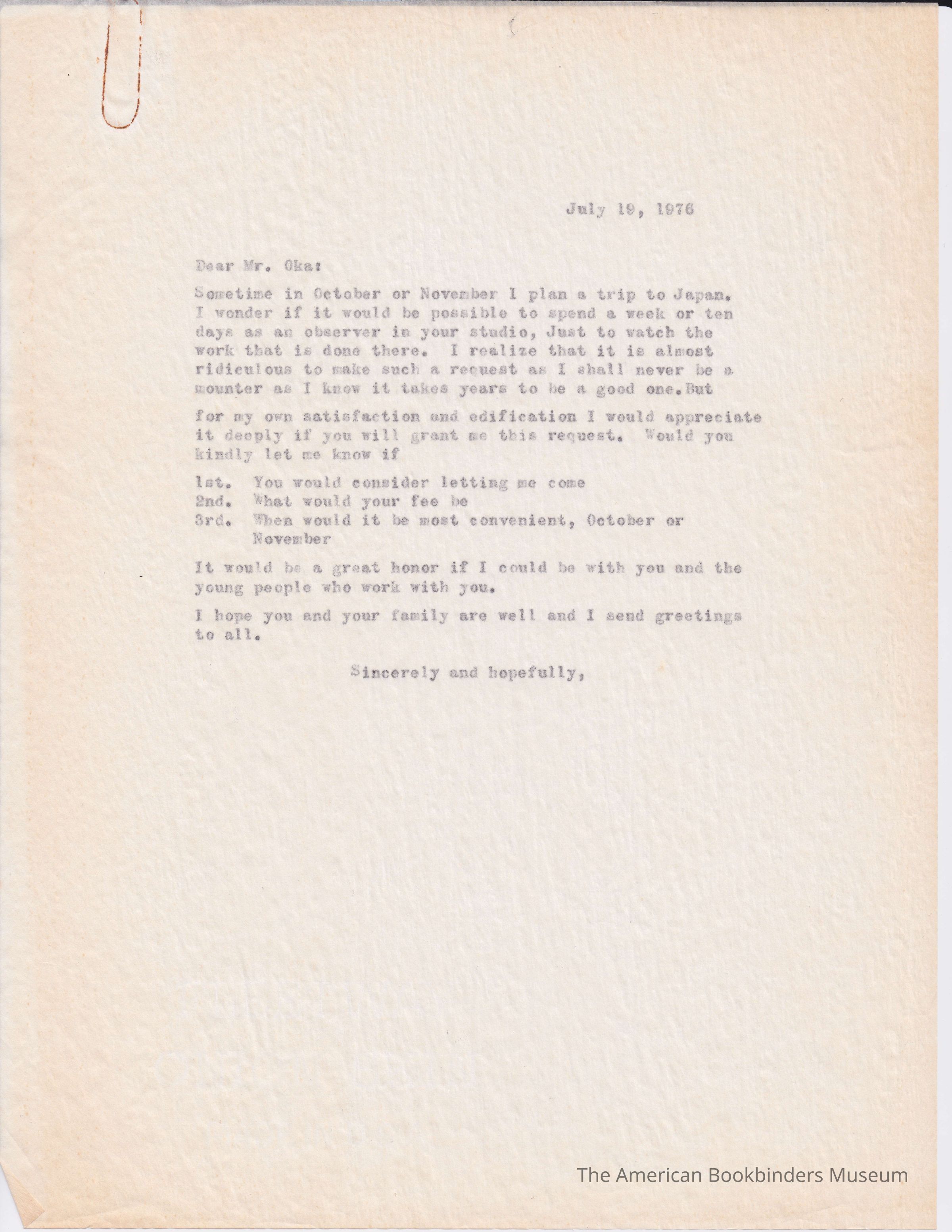 1. Letter from Patri letting Oka know she is planning on visiting Japan, and asking if she could visit his studio