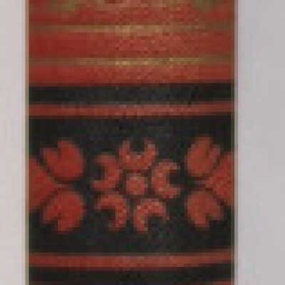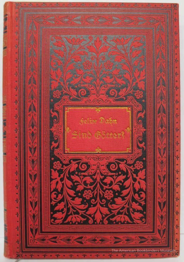 Bright red cloth binding, some fading on the spine. Rear cover has blind-stamped plain border. Front cover has rings of abstract, plain, and vine borders stamped in black, and a central panel of vines and flowers around a badge of black and gold with text in gold. Spine has bands and vines of black and gold, and the text in gold. Marbled edges, white grosgrain endpapers.