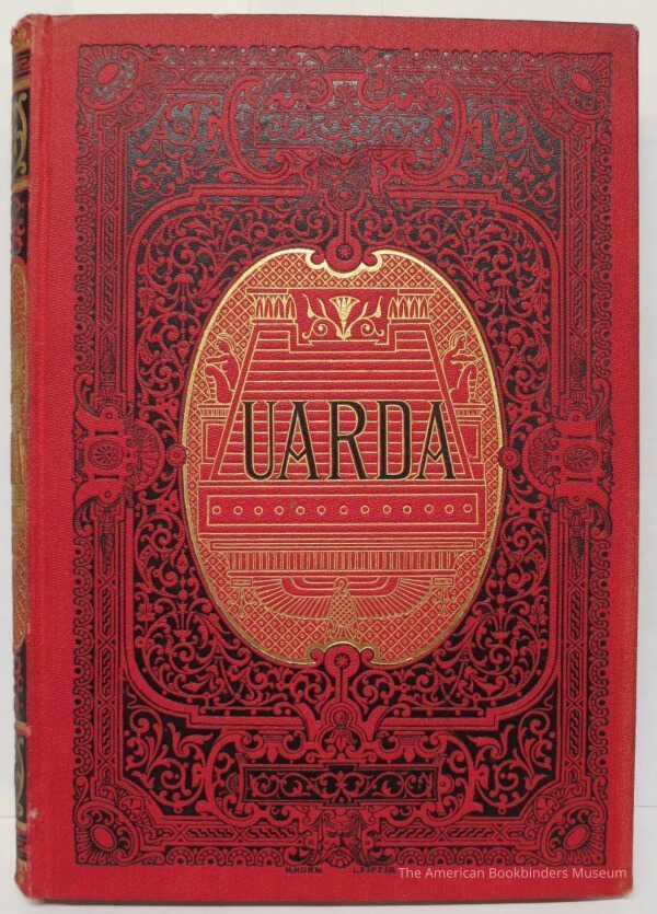 Brilliant red cloth binding. Back cover decorated with black borders. Front cover with elaborate black vines and borders, with a mask at the bottom. Central badge with black and gold title text and a gold designs suggesting Egyptian building and statuary.