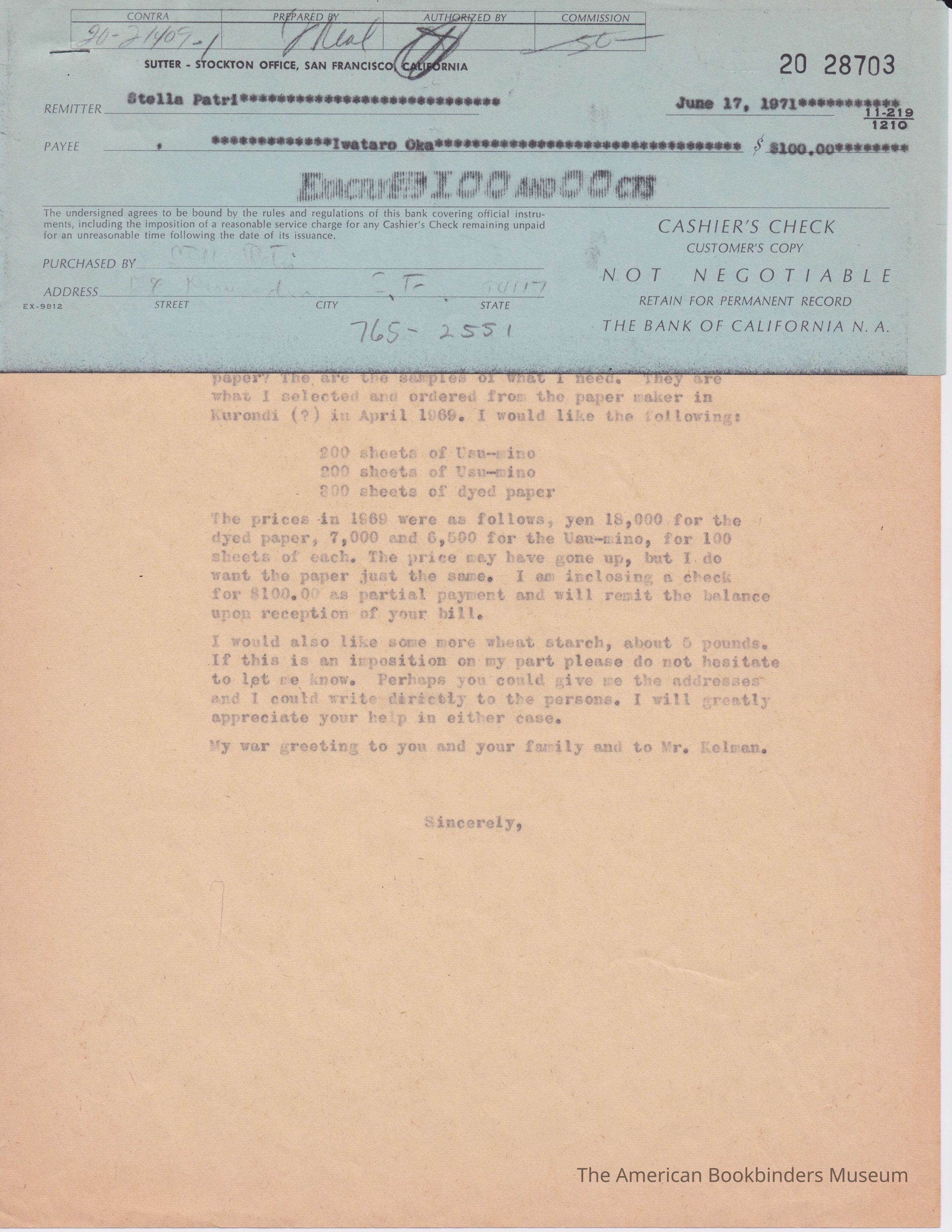 A letter from Patri asking Oka to purchase and send her various types of papers. A check with partial payment is stapled with the letter.Collection