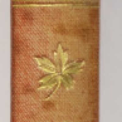 Bright red cloth binding. Interlaced decorative borders in black and gold around central panel with sprays of flowers, decorative vines, and a mask face all in gold. Title and author text in gold in a central black badge. Spine features alternating lines of black and gold borders, with gold text, logo, and five-point leaves. Decorated endpapers, all edges gilt.