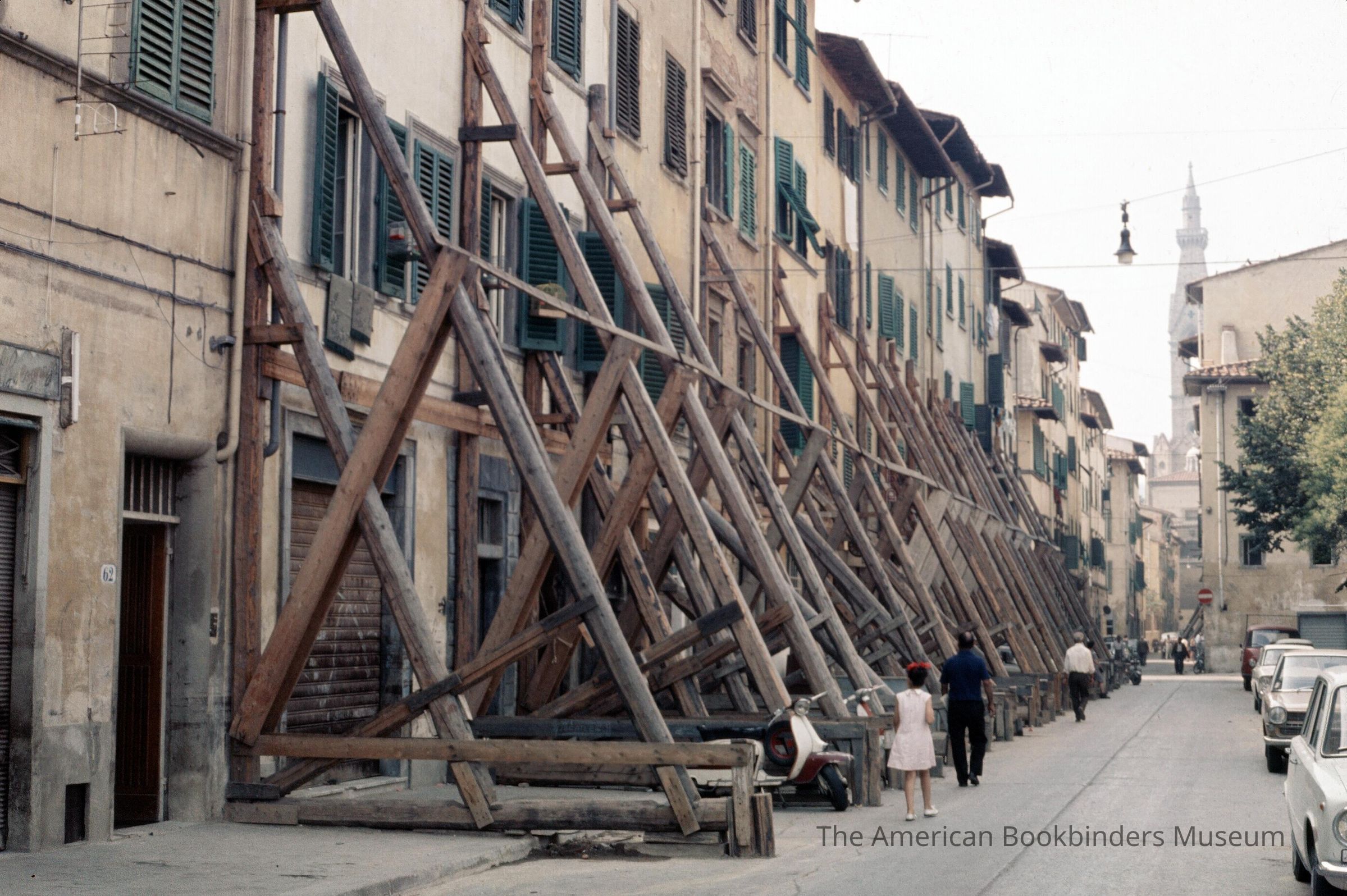 A row of houses bring braced by poles of wood. A tall building looms in the background. A tree is partly out of frame on the right.Photograph Details
