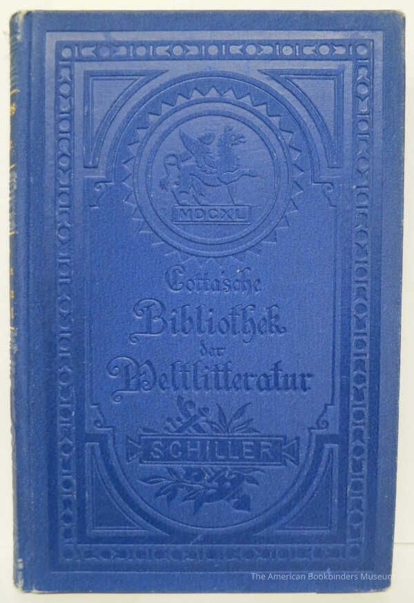 Bound in vertically ribbed royal blue cloth, blind stamped cover on front and back, featuring decorative borders and emblems. Spine has a combination of blind stamping and gold stamping for text and gryphon logo. Stamping pattern matches KRM.010. Printed endpapers, marbled edges.Notes