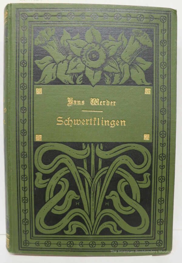 Dark olive green cloth binding stamped in Art Nouveau-style daffodil design in black with text in gold. Green patterned end papers