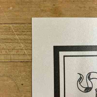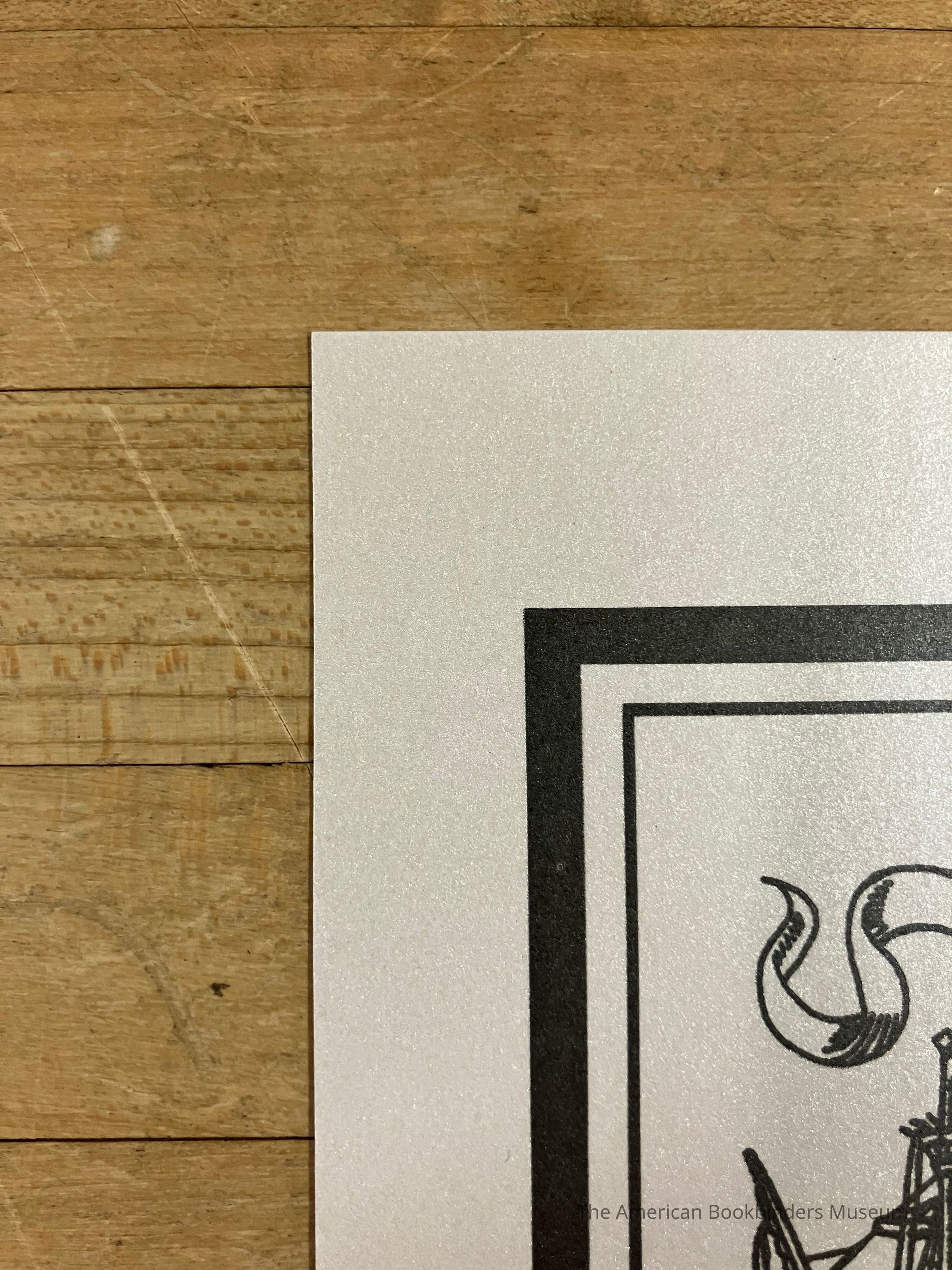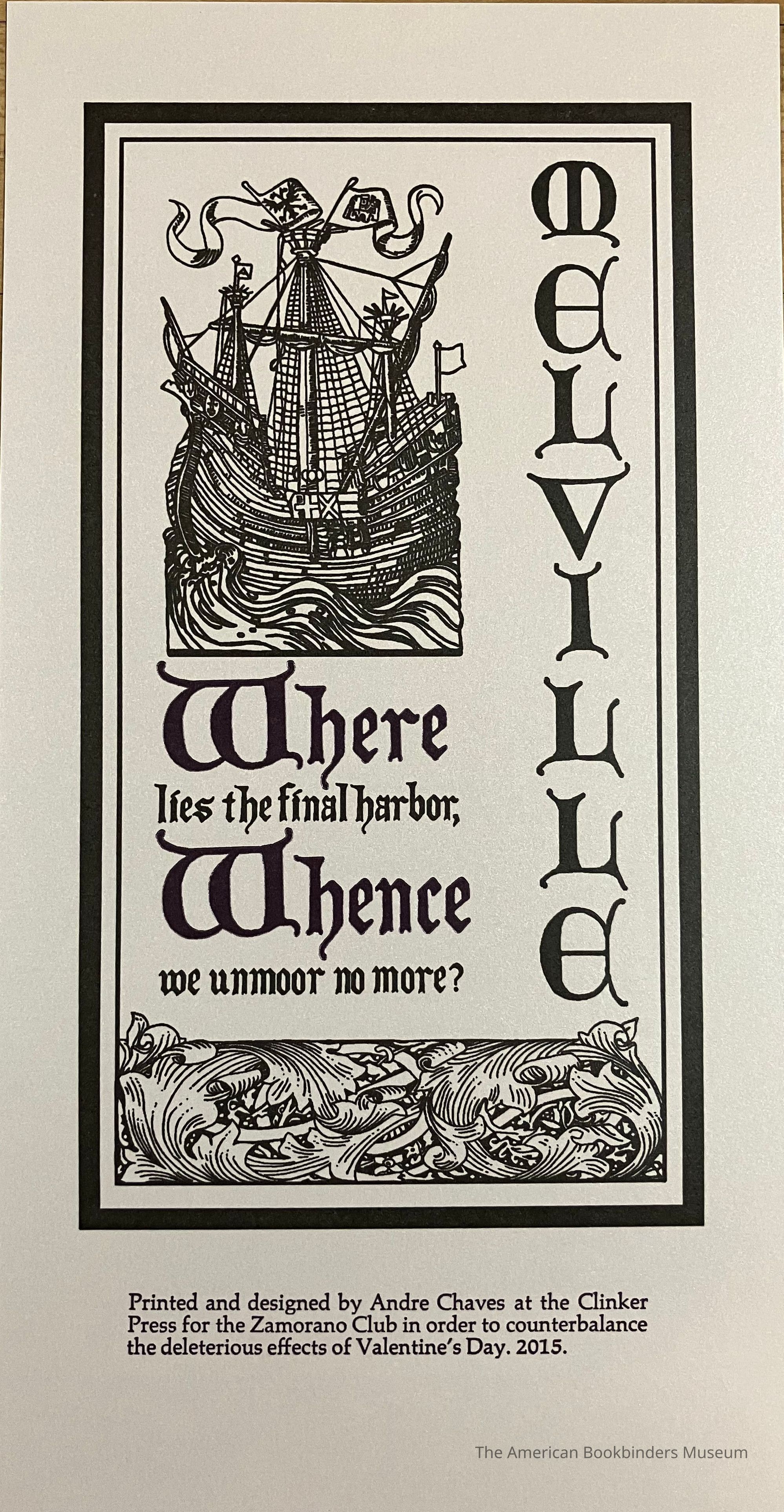 In a solid frame is 'Melville' on the right, an image of a ship on the left, and text below. Underneath the text is a leaf design where the leaves curl back on each other. The paper is off-white with a fine sheen.Collection