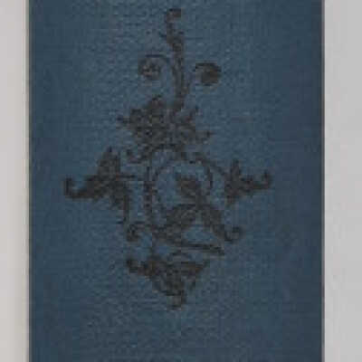 Mid-blue cloth binding. Back cover stamped in black with plain border and central badge of publisher's logo. Spine stamped with thin black bands and vine spray, with text of author, title, and publisher in gold. Front has title in fancy gold characters, with a plain black border, black text for author's name, and black flower-draped sword and lute. Polished stone grey endpapers.