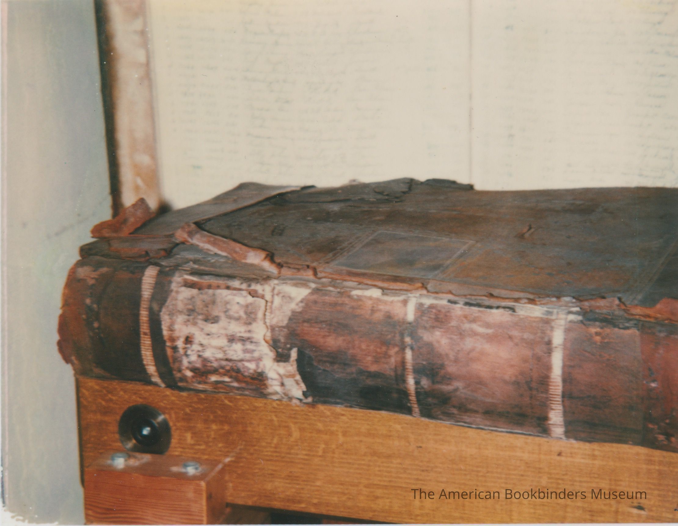 A damaged book is in the foreground on some table. The background shows an open book, the pages covered in handwriting.