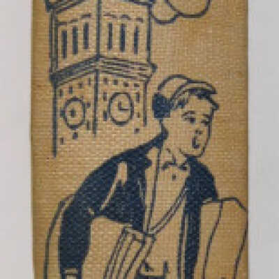 Bound in light tan cloth with a full cover onlay illustration of a young man in military cap and jacket, holding binoculars, in the forefront, behind which is a three paneled scene of a power boat and white frothy wake. Spine is stamped in blue with illustration of a boy selling newspapers.