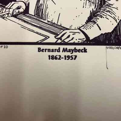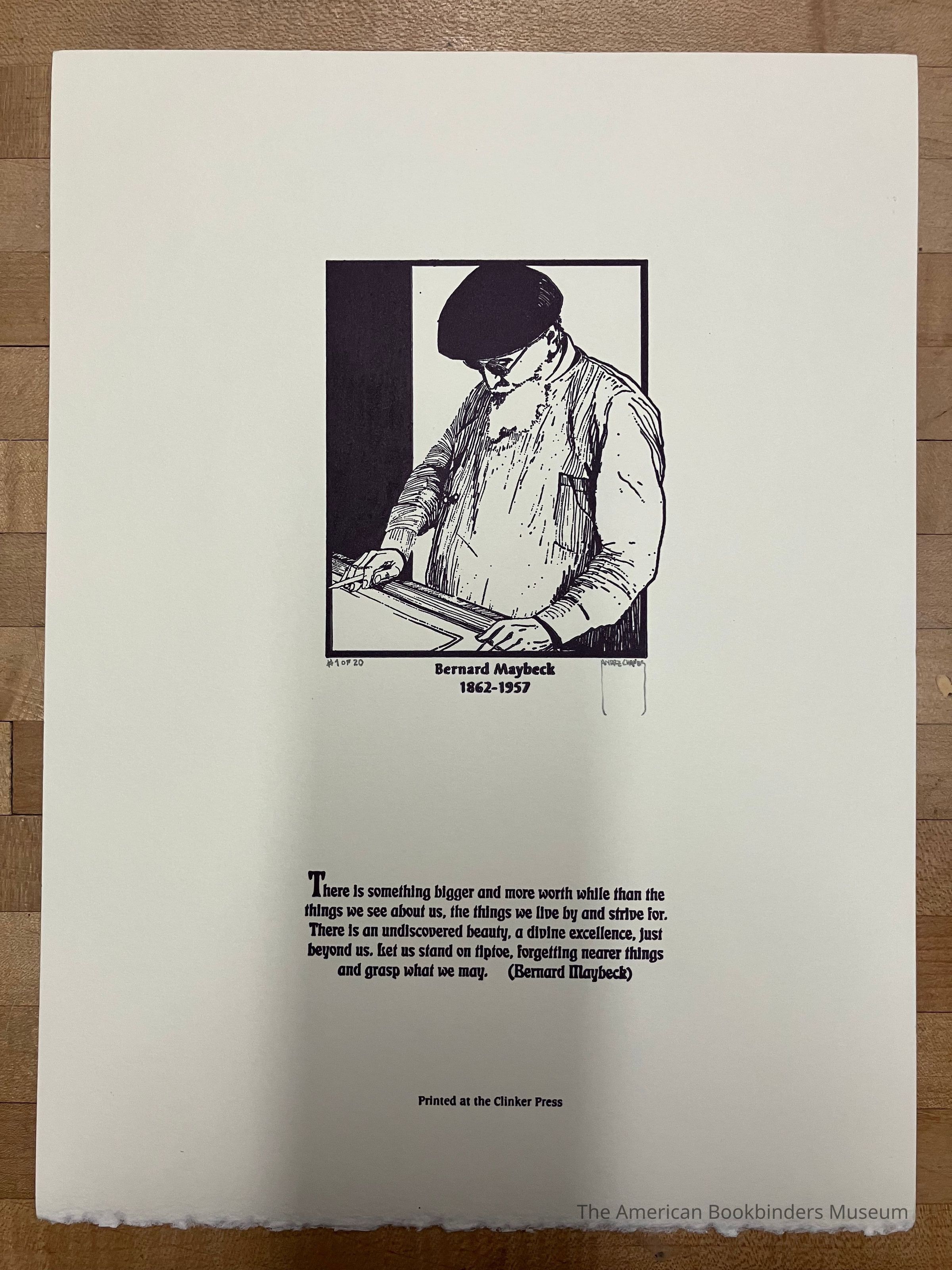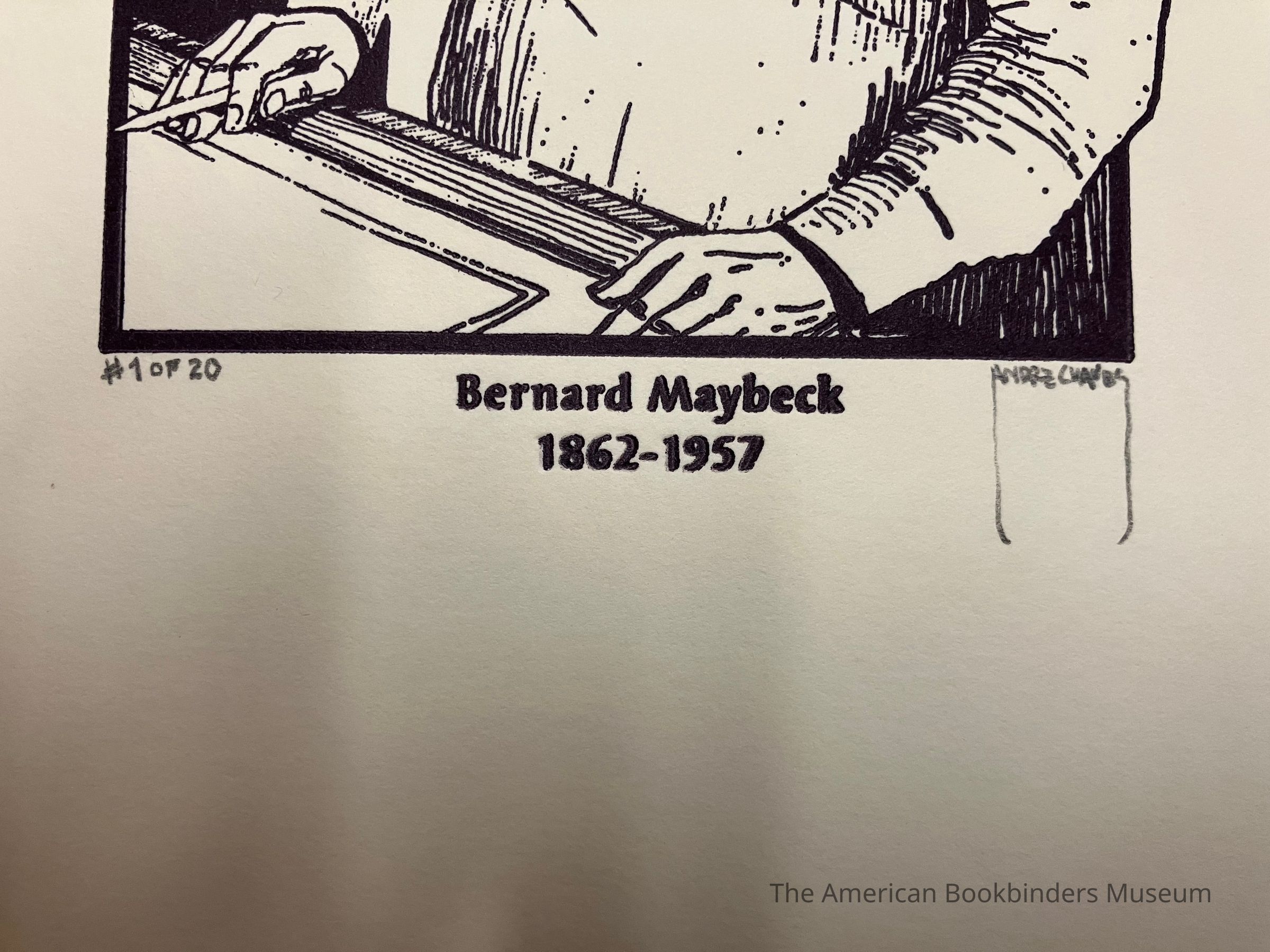 Plain paper with black ink. In the center is an illustration of a man working at a bench, with glasses, a dark hat, and apron. Labeled as 'Bernard Maybeck, 1862-1957'. Text below. Bottom edge is rawCollection
