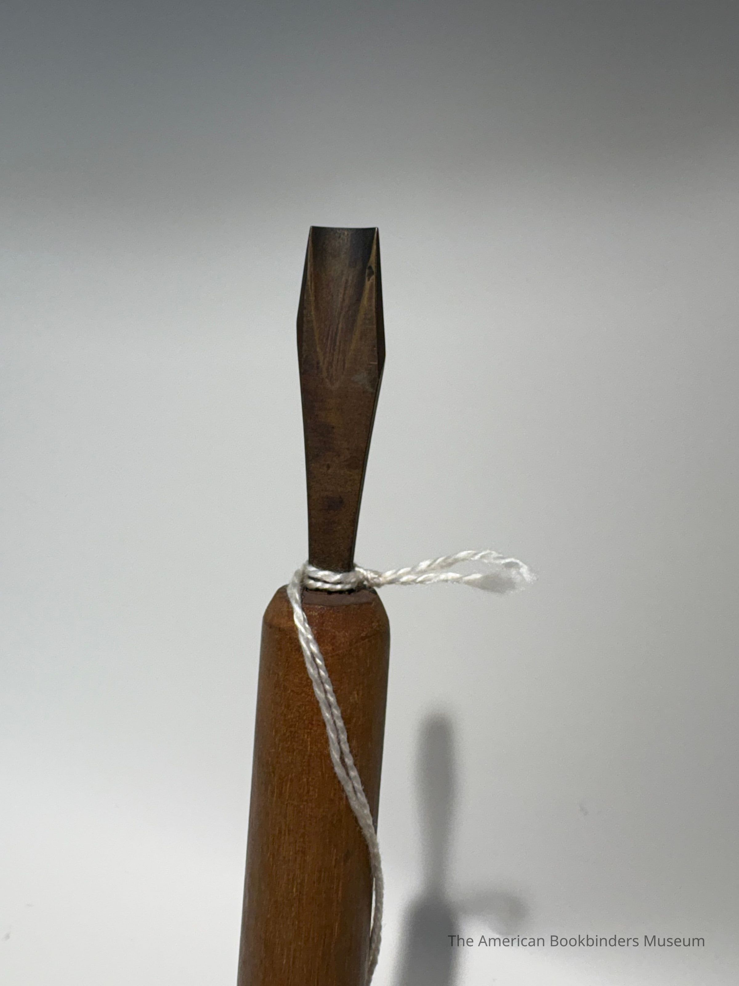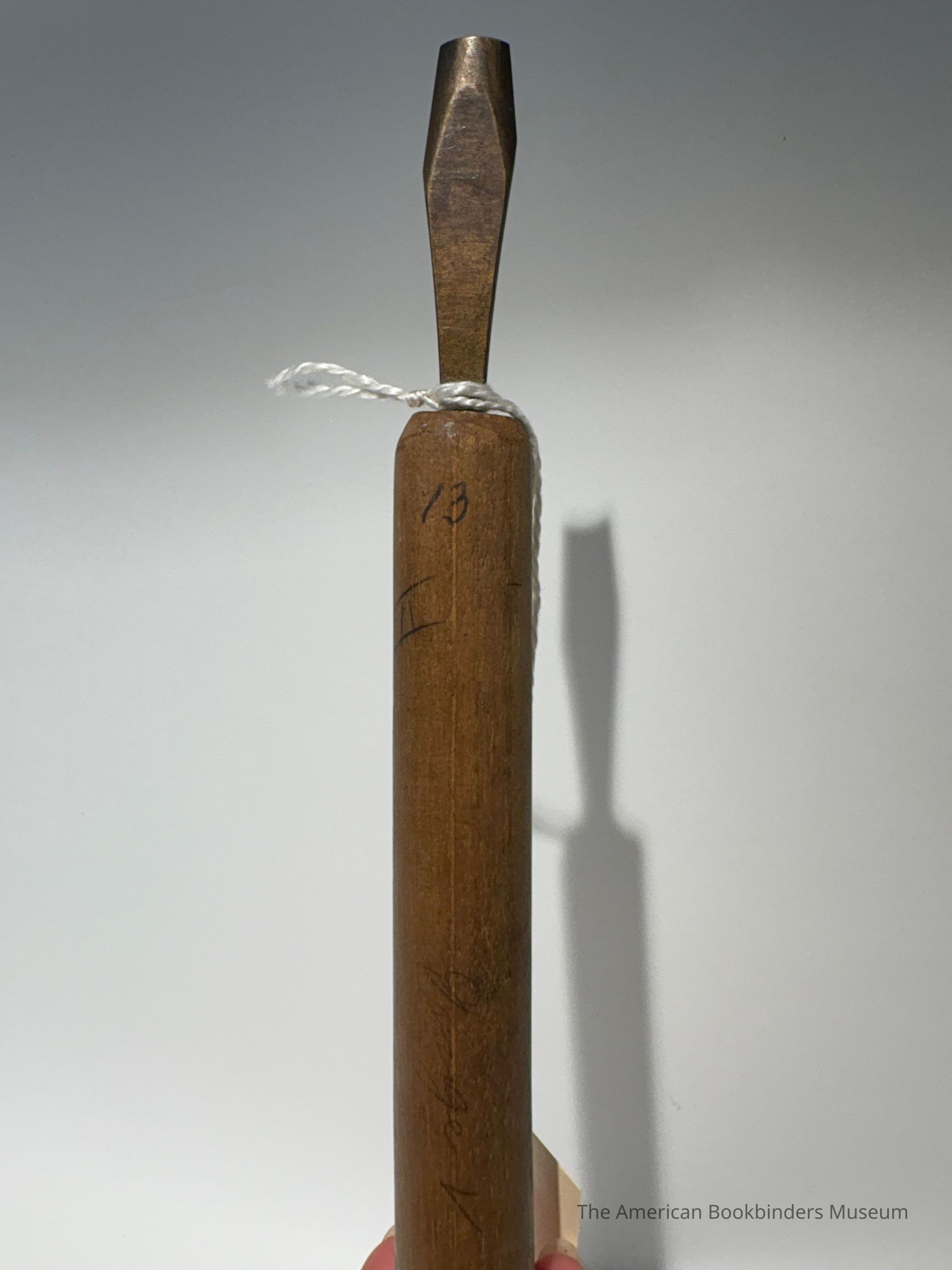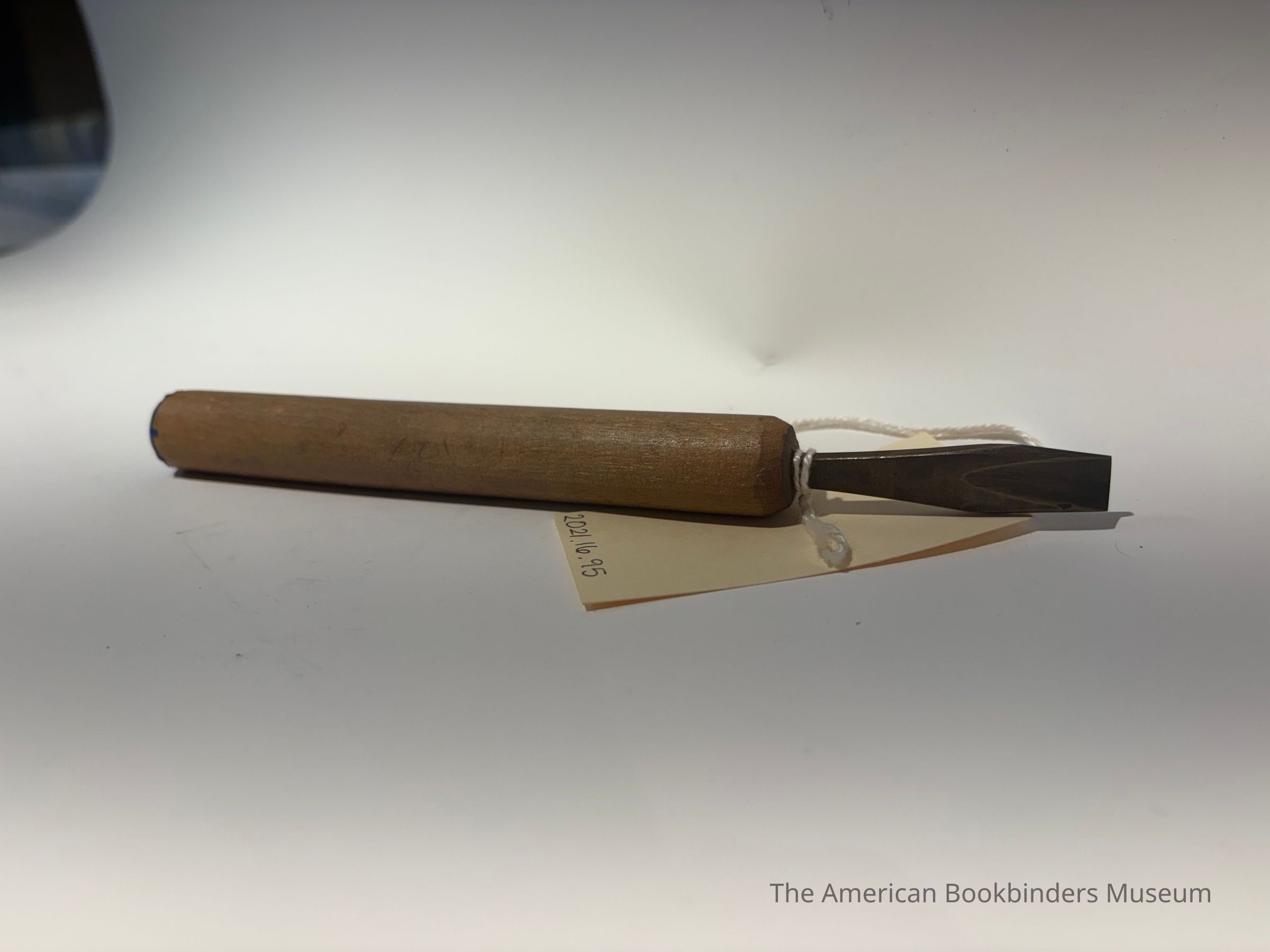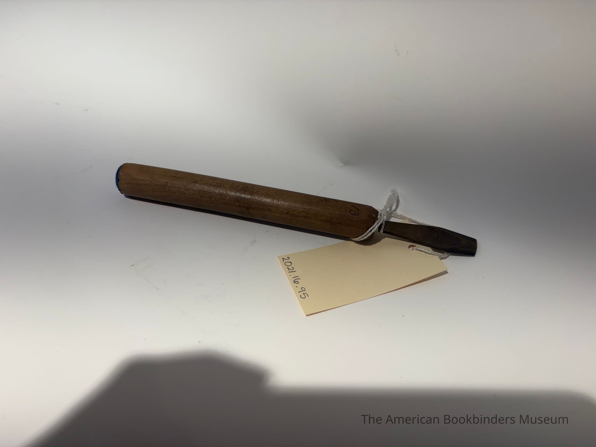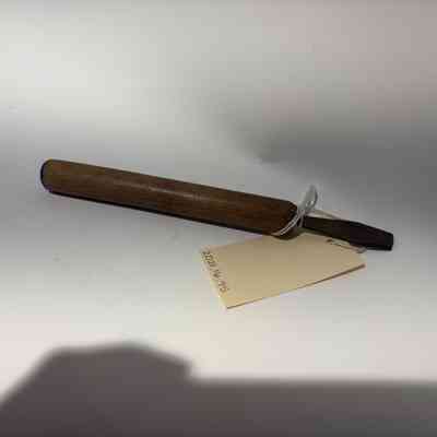 Metal gouge hand tool with dark wooden handle. The end of the handle is painted blue.