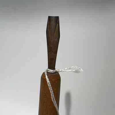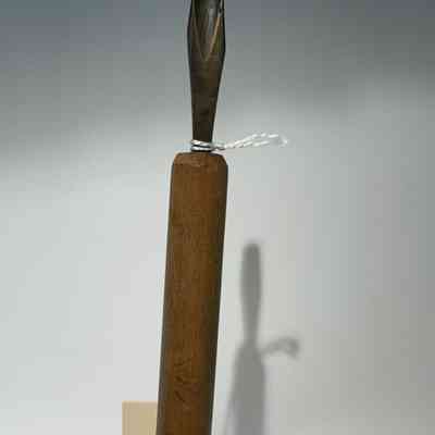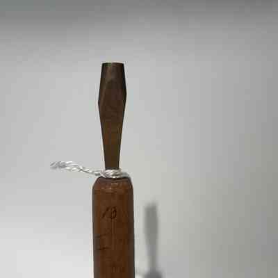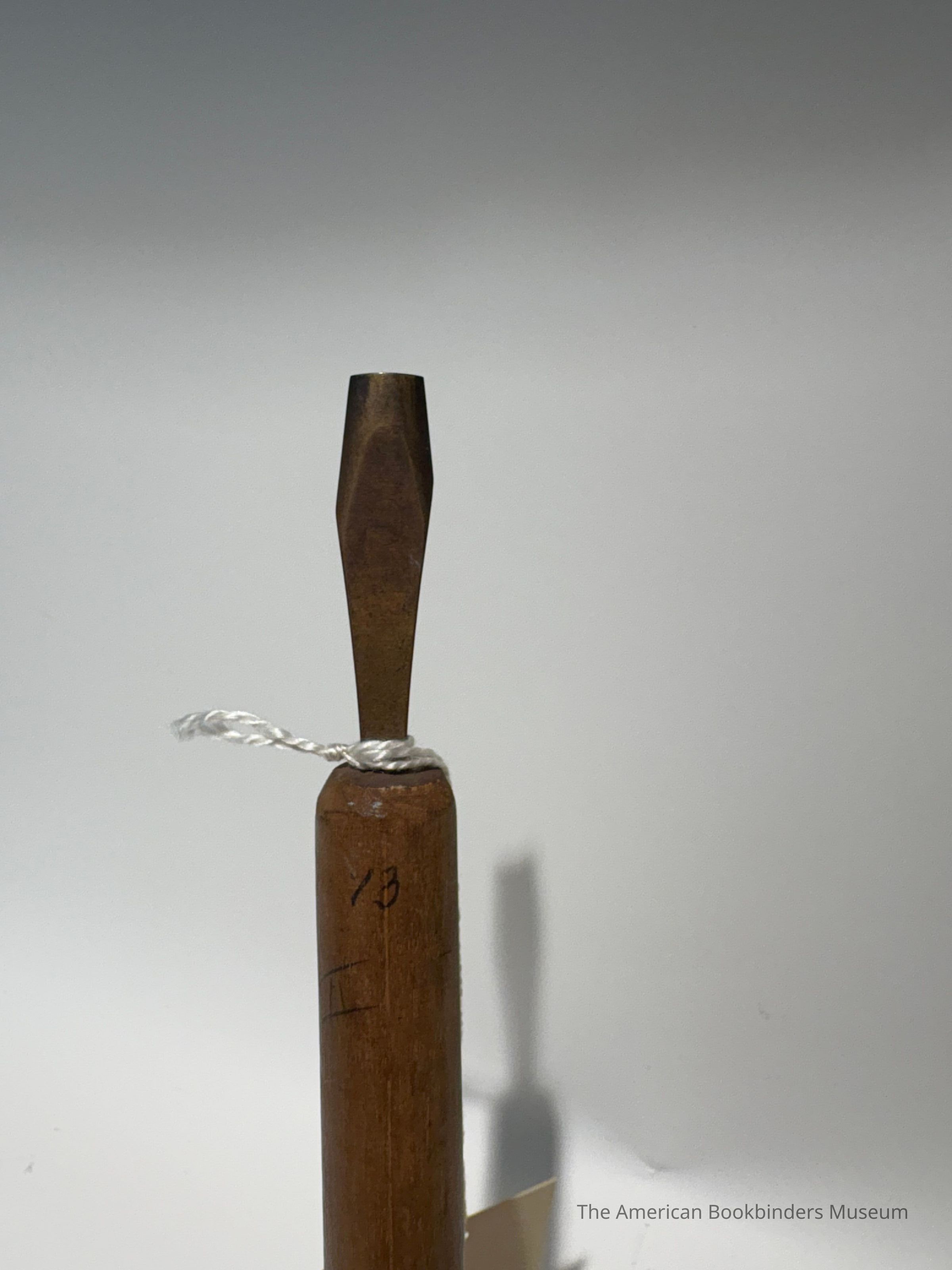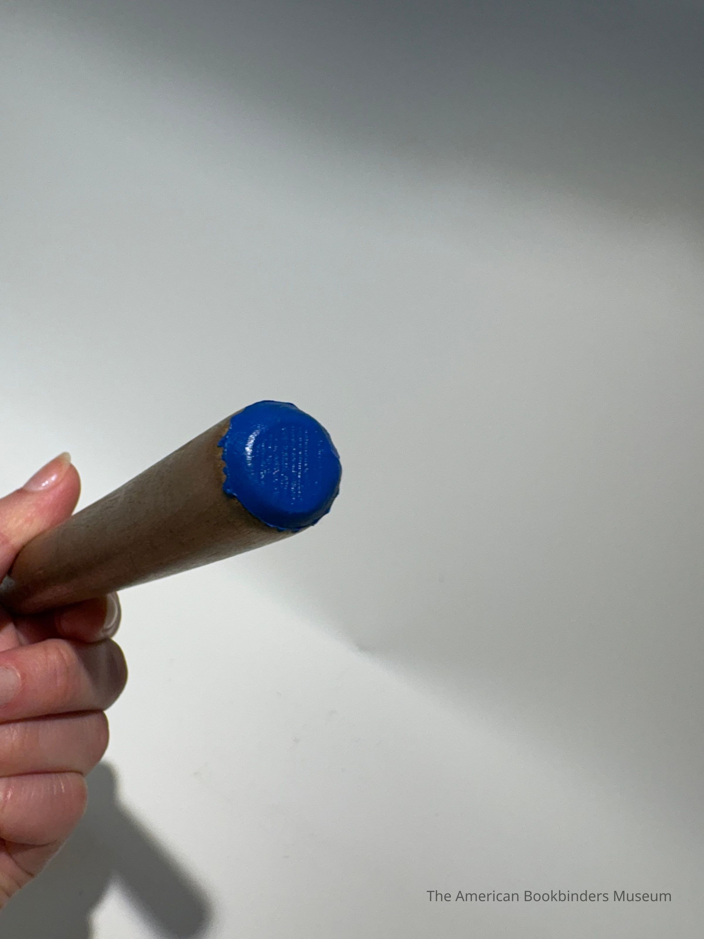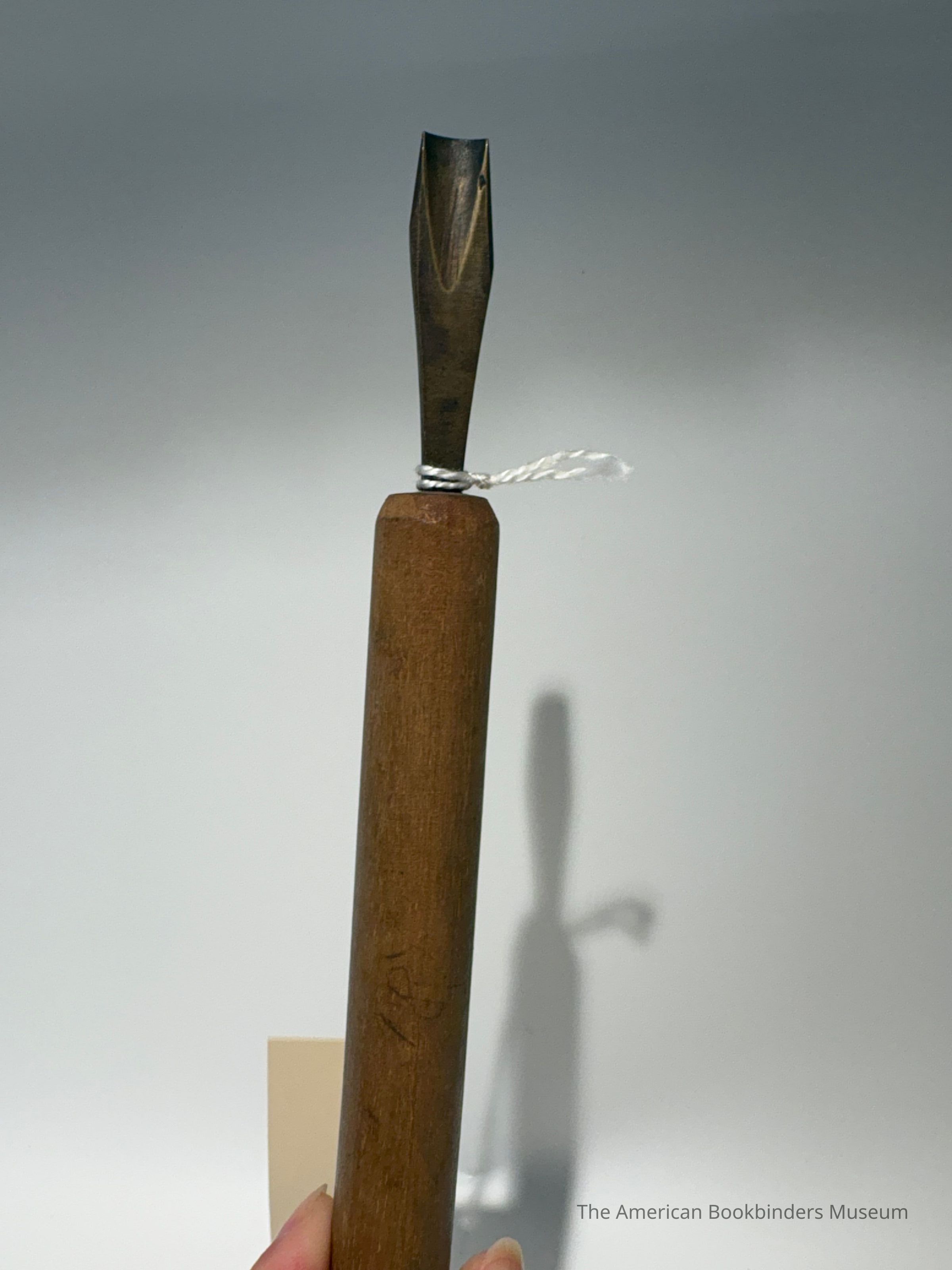 Metal gouge hand tool with dark wooden handle. The end of the handle is painted blue.