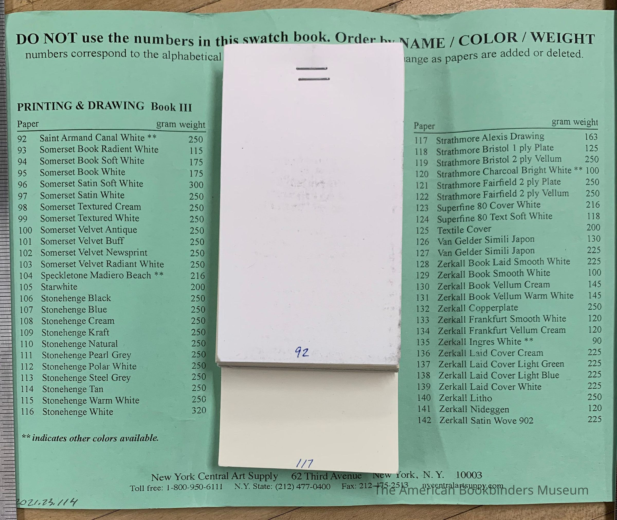 Sample book with two sets of samples stapled to a light green cover.Collection