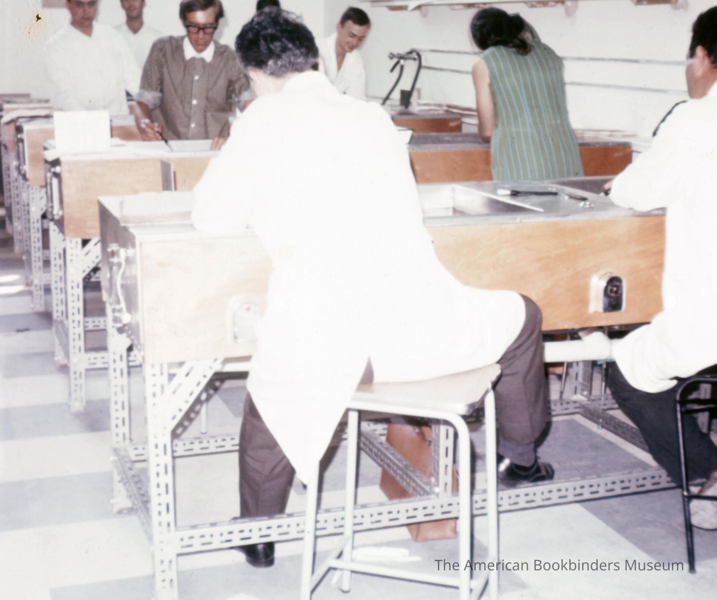 Scan of a slide. Shows four conservators at washing stations.Photograph Details