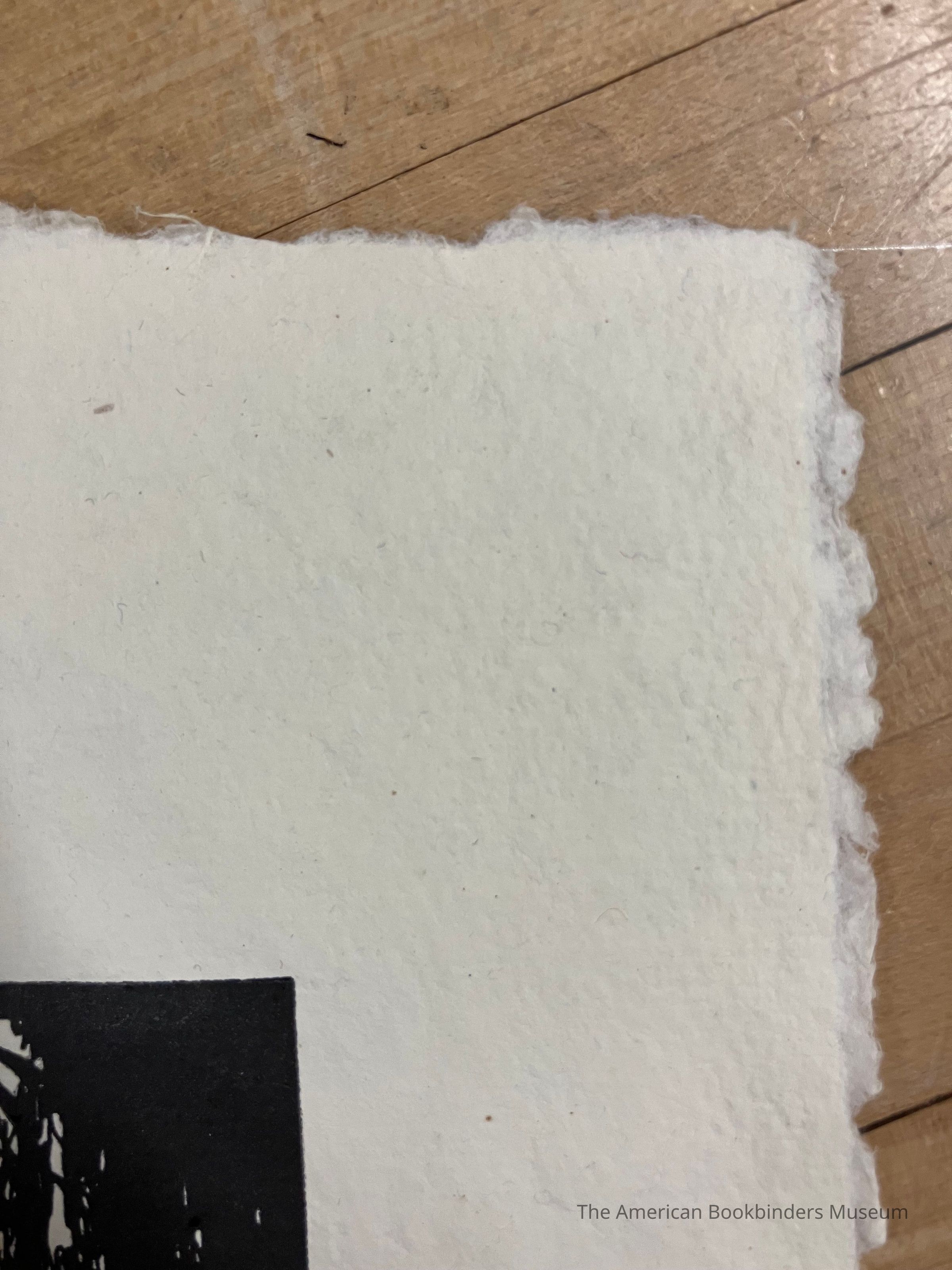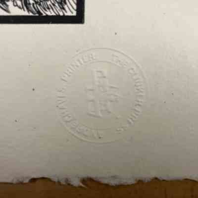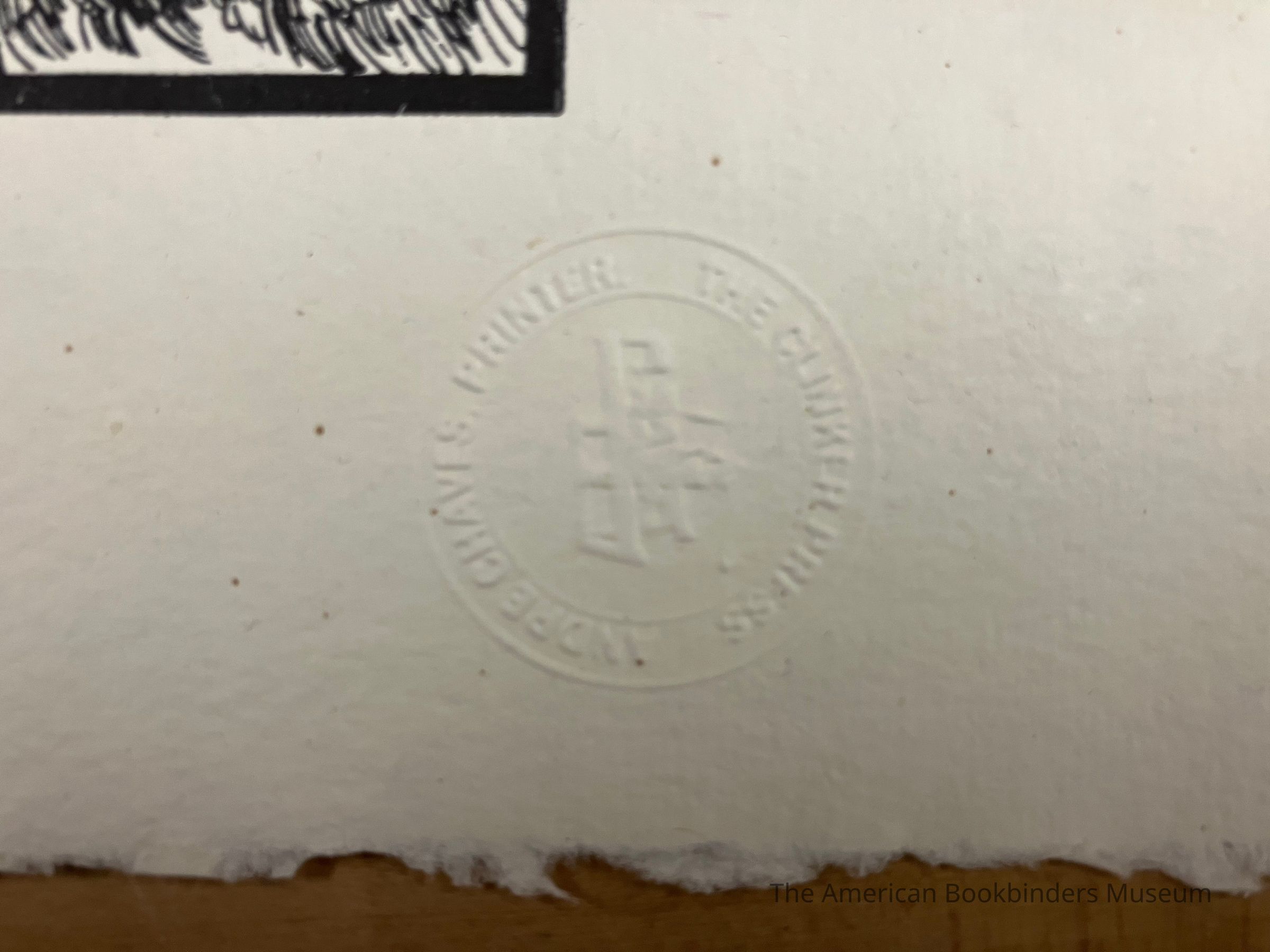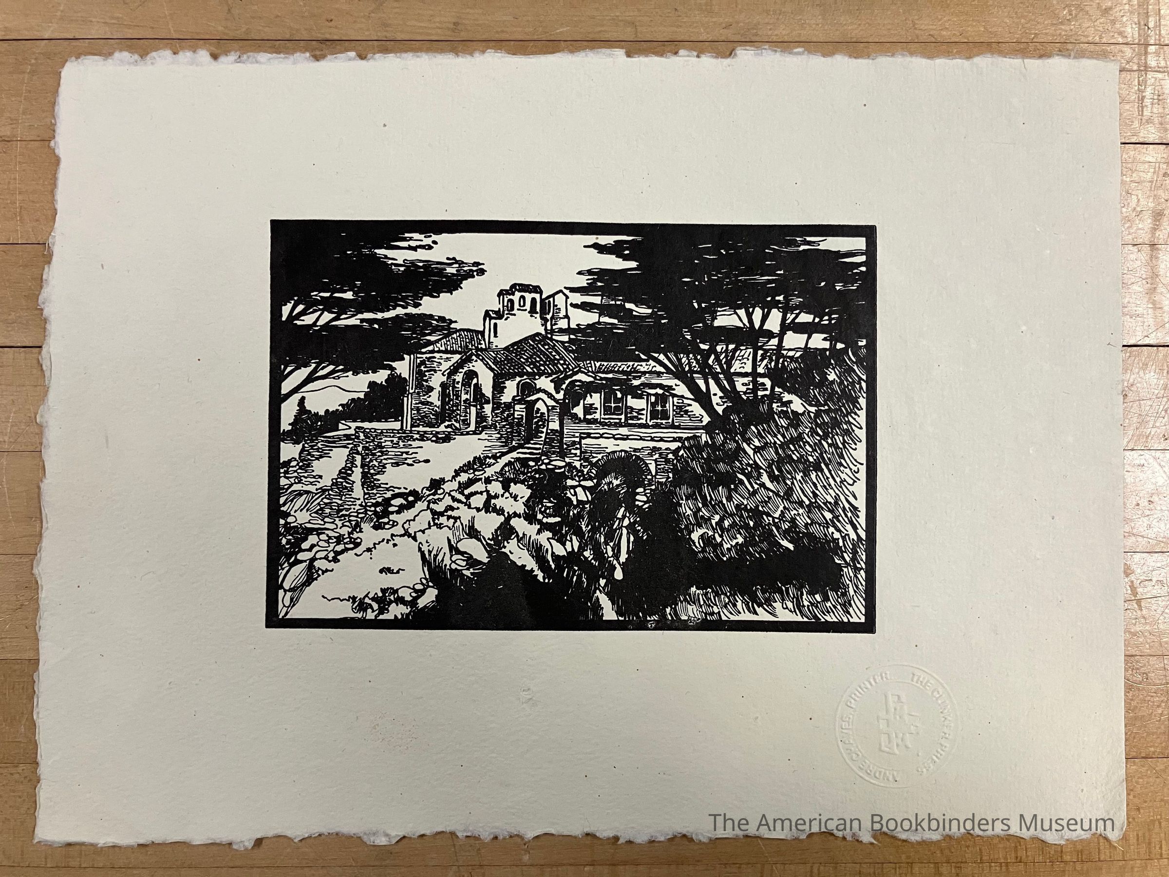 A black and white print showing an etching of a building. On the left side of the building is a low wall, There appears to be a path leading to the entrance running from the bottom left corner to the center of the image. An arch over a stream is to the right of the path. In the foreground on the far right and left of the image are trees. Top, left, and bottom edges deckled; the right edge trimmed.Collection
