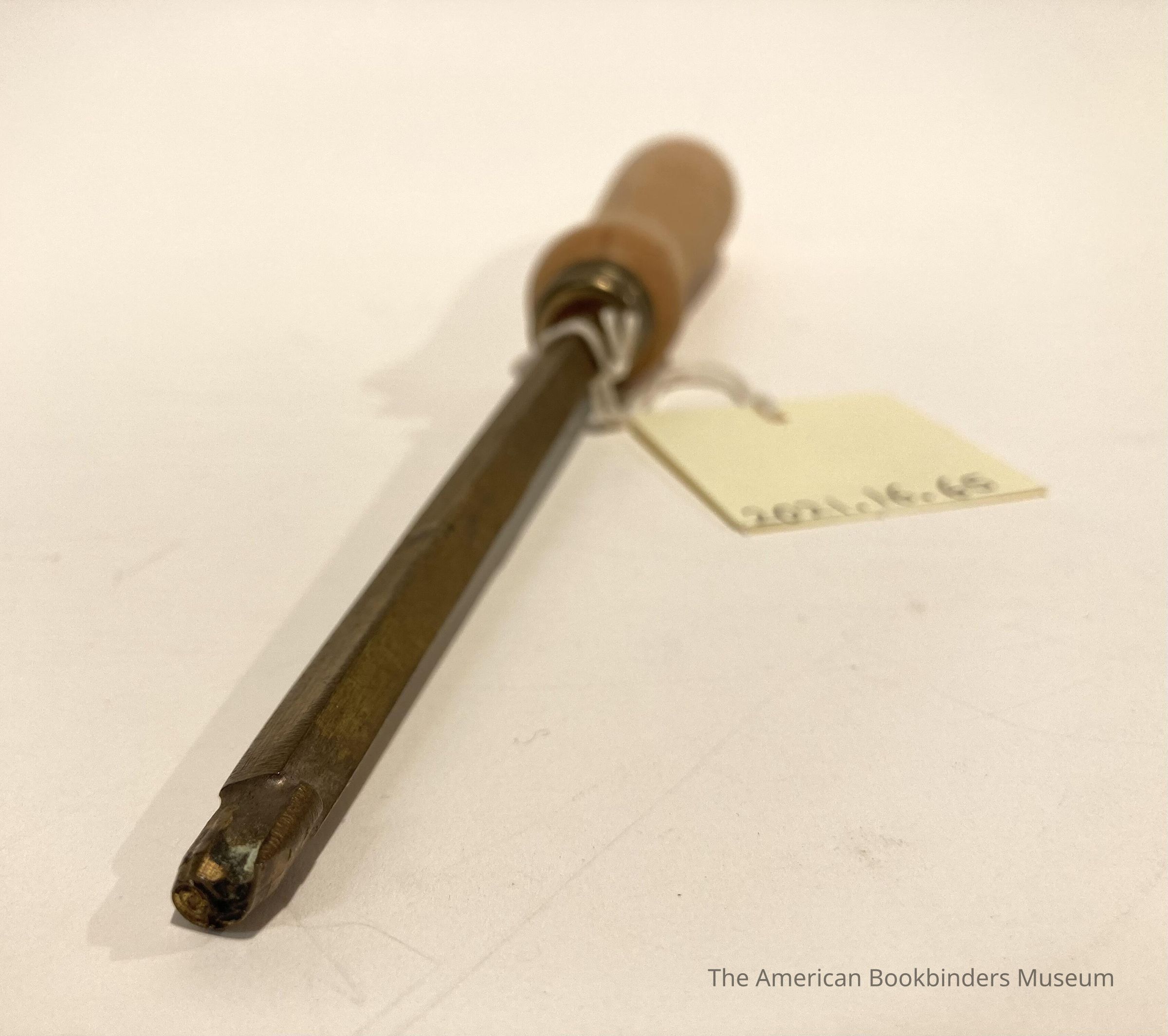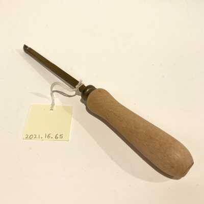 Hand stamp with wood handle. Small, 1/2cm swirl design with two leaves on the inner line. One dot and one line underneath swirl. 2 identical tools in mirror image.Collection