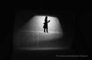 A silhouette of a man reading a book is standing on top of a column of text. The page is backlit and the text from both sides of the paper is visiblePhotograph Details