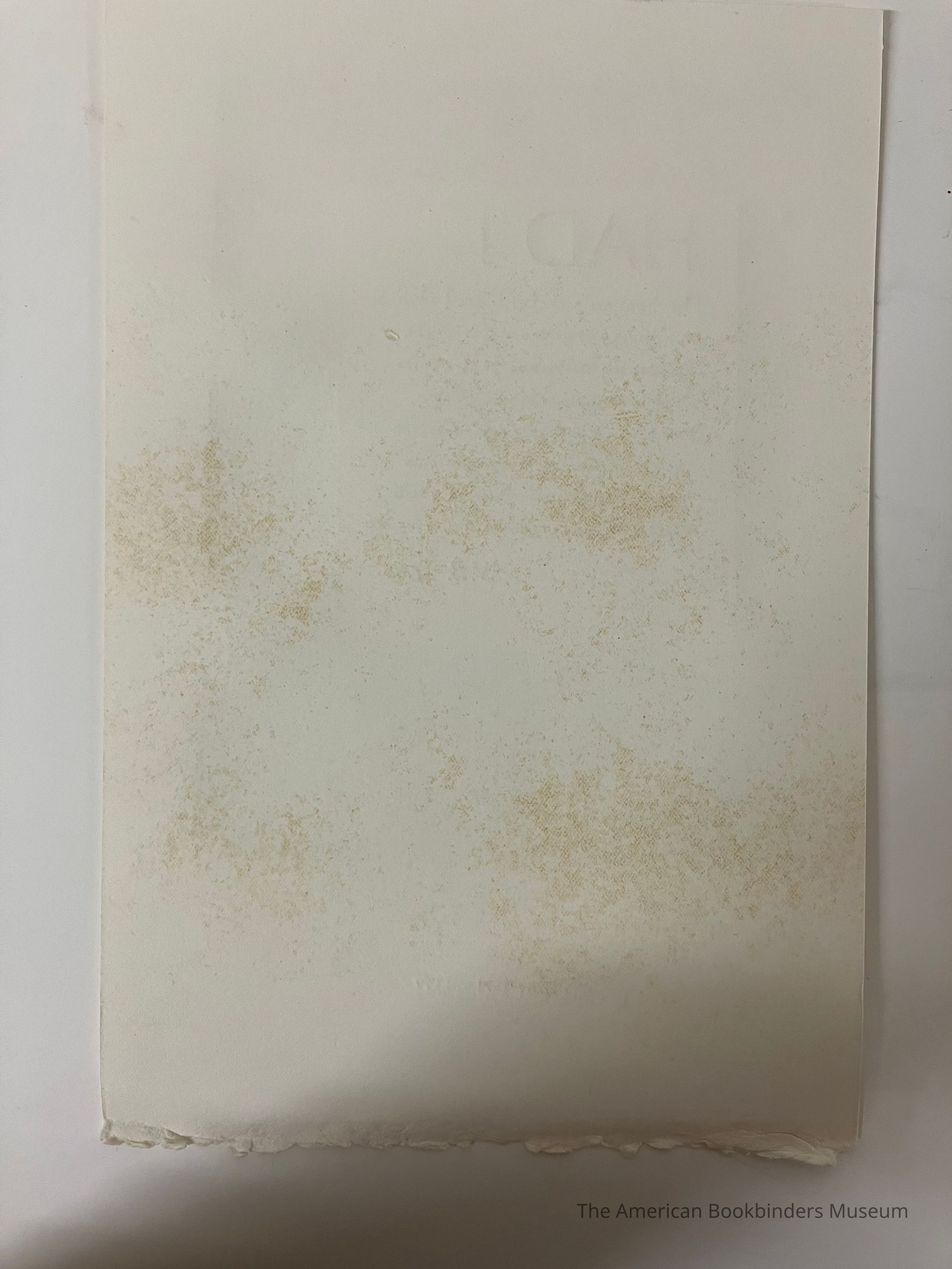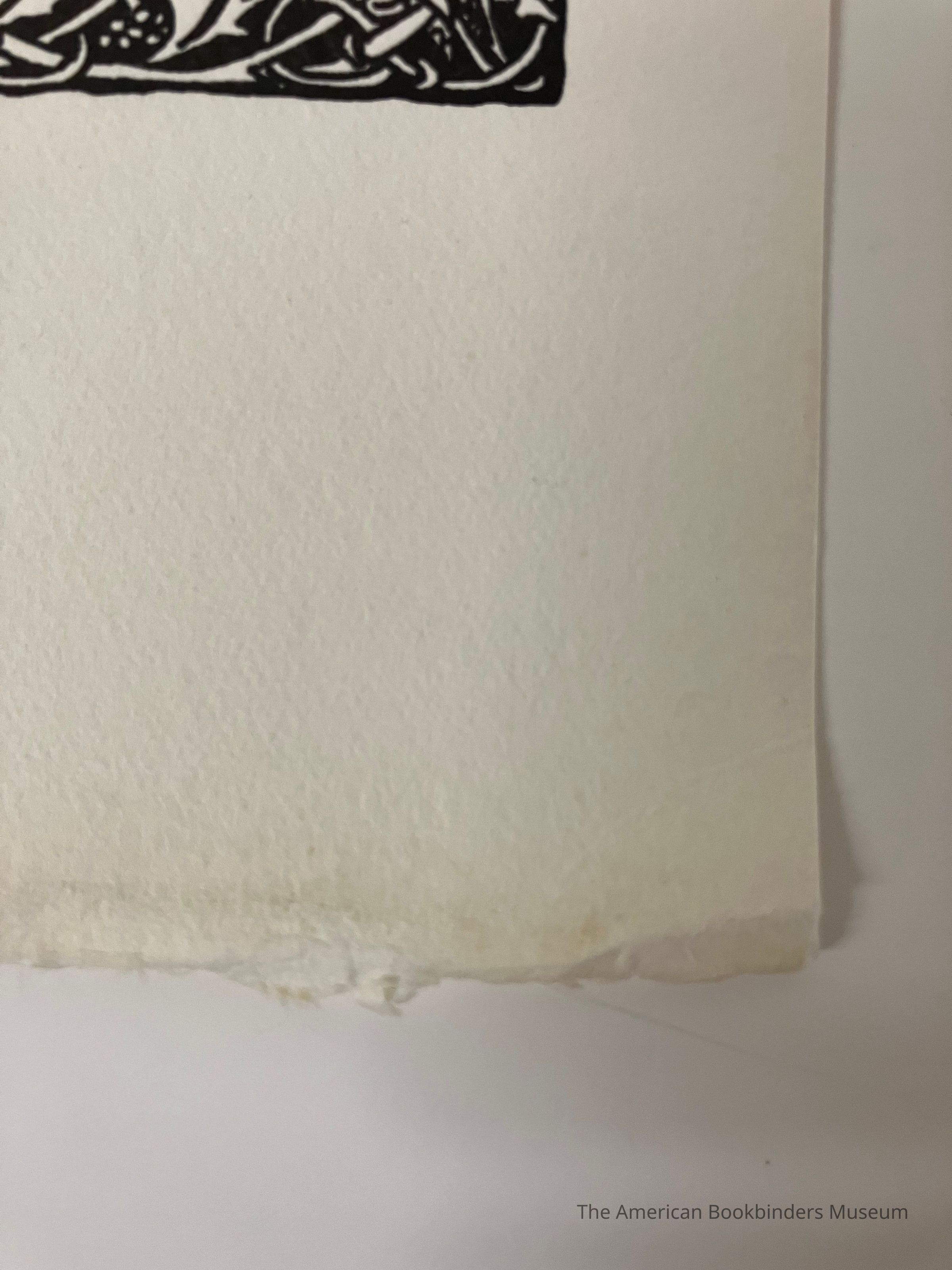 Print with text set within a wide frame of grapes and vines. First few words are in red, with the rest in black. Deckled bottom edge.Collection